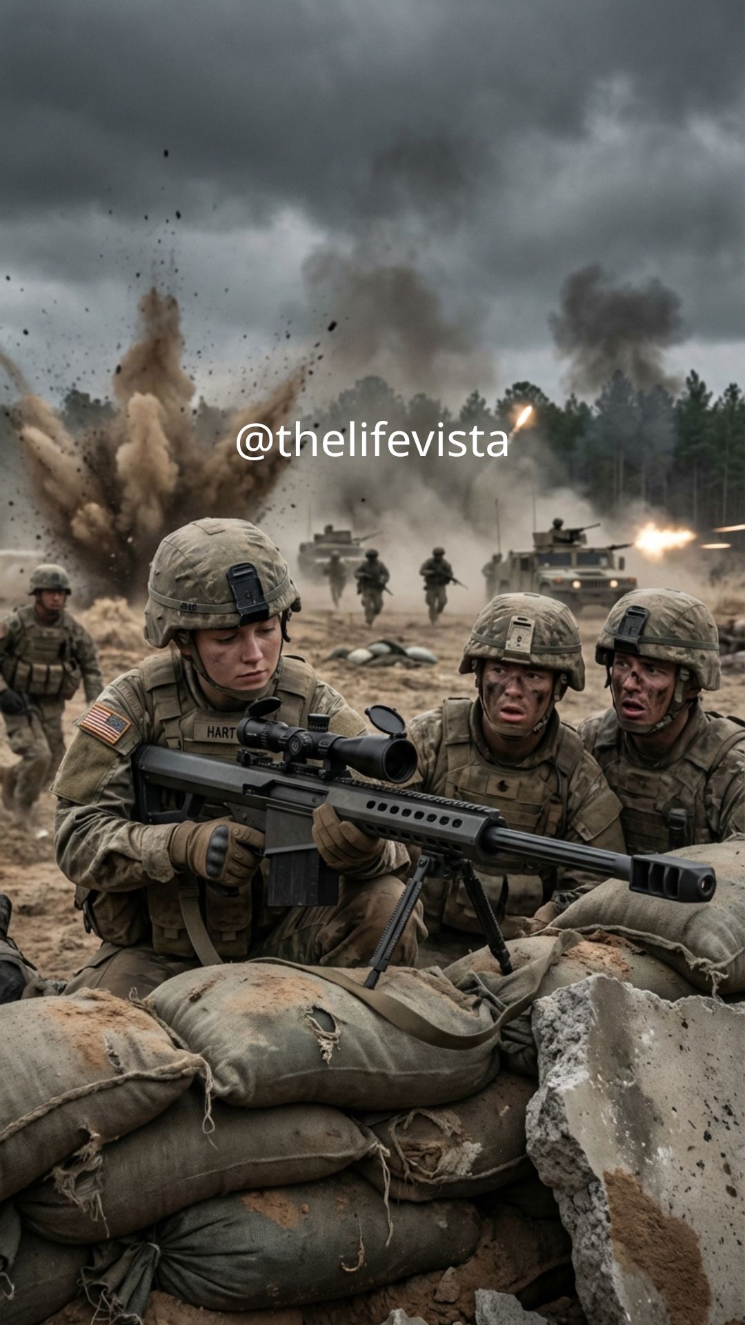 The Barrett’s trigger had a 4-B pull weight. She applied 3 lb, then 3 and 1/2, then cracked. The massive 50 caliber rifle bellowed, the sound unlike anything most of the soldiers had heard before. The muzzle break redirected the blast laterally, kicking up dust in a violent cloud. Even with the weapon’s recoil mitigation systems, it bucked hard against Lia’s shoulder.