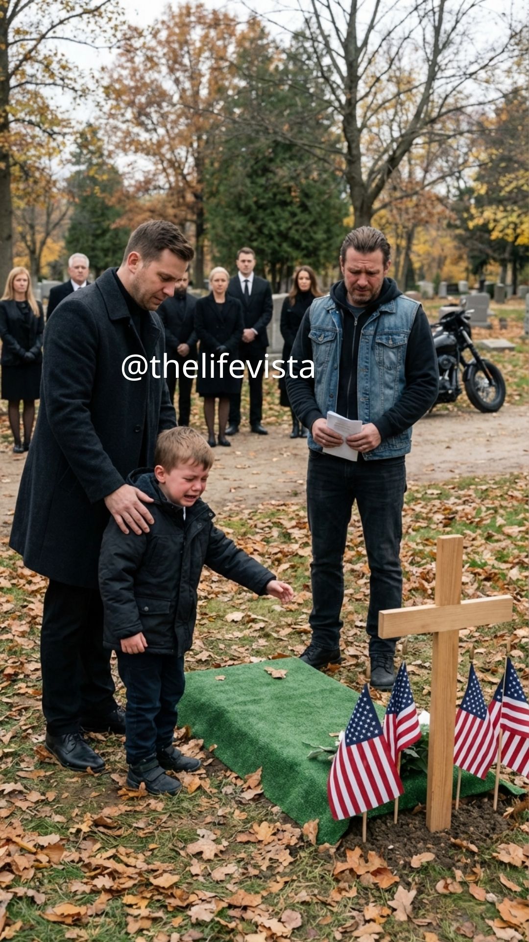 The afternoon sky above Riverside Memorial Cemetery hung low and colorless, the kind of dull autumn gray that seemed to absorb every sound and emotion and return it heavier than before, as though the day itself had taken responsibility for holding the sorrow no one present could fully carry without breaking under its weight. October wind threaded through rows of small American flags that had been placed beside several graves earlier that morning, their fabric snapping softly against the wooden sticks as if the air itself could not settle down and had decided instead to keep moving so that no one standing there would mistake this for an ordinary afternoon. People had begun drifting away after the service, moving in slow, uncertain clusters toward the gravel parking lot, their shoes crunching across fallen leaves while quiet conversations, half sympathy and half awkwardness, floated through the cold air and dissolved almost as soon as they were spoken, because grief has a way of making even familiar language sound temporary and insufficient.