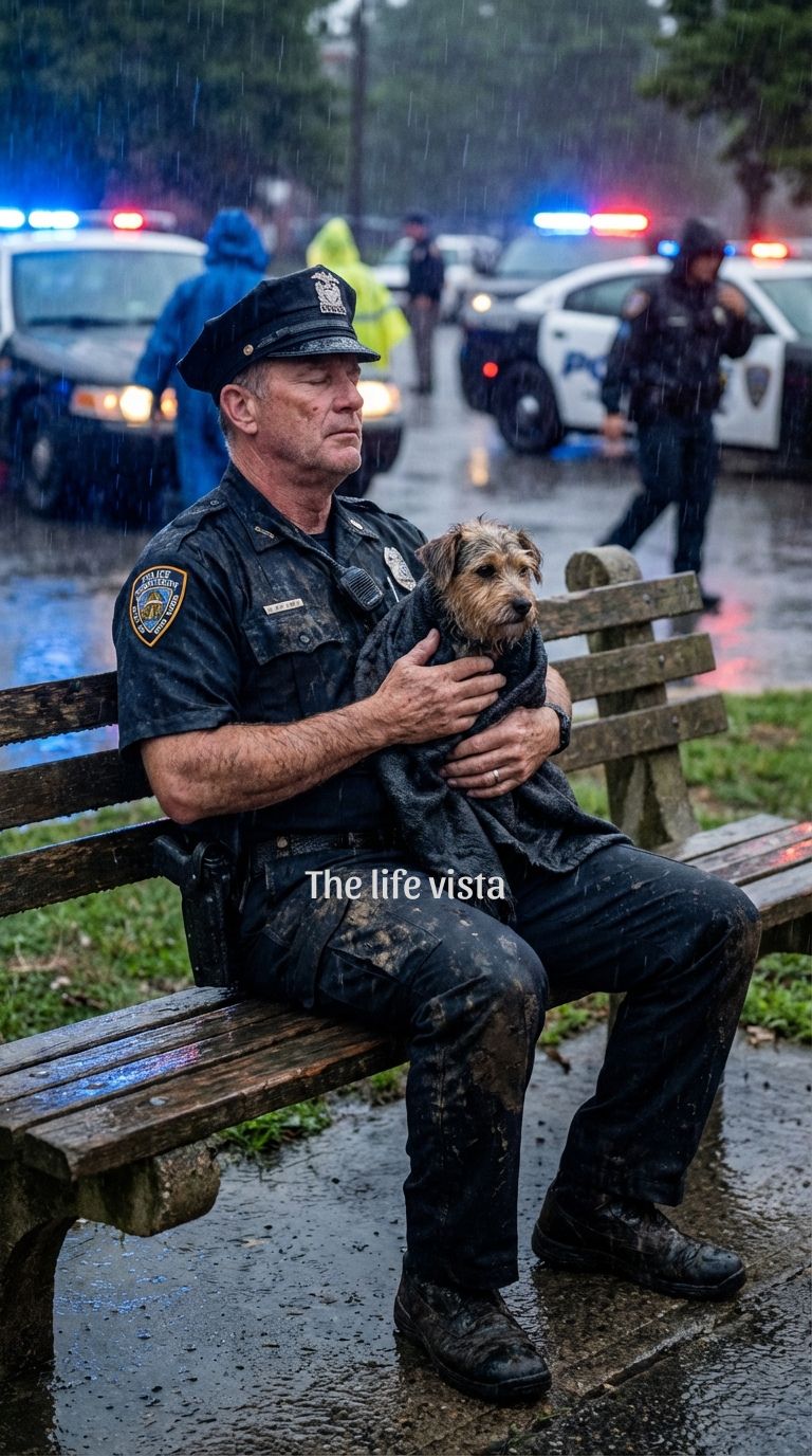 When he reached the steps, he didn’t say a word. He just handed me the gasping, coughing dog and collapsed onto the wood. He sat there in the downpour, his head between his knees, his uniform ruined, while the neighbors finally lowered their phones in a stunned, heavy silence.