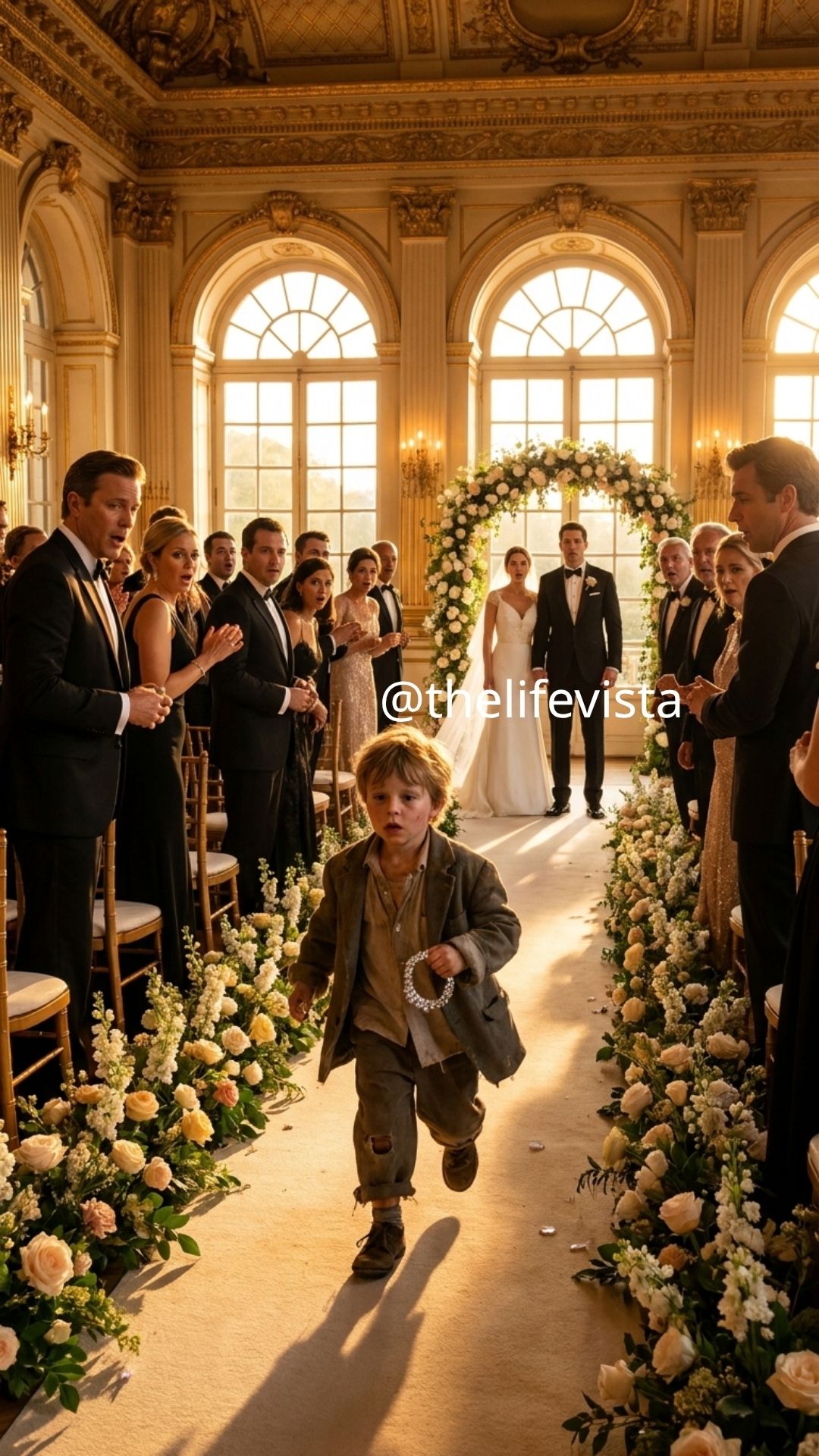 Beside him, the bride—Charlotte Reed—instinctively reached for his arm, her grip tightening slightly as the boy approached the altar steps, her expression shifting between confusion and unease as she tried to understand why something so small could suddenly feel so threatening. The boy stopped just a few feet away, his body trembling, his breathing uneven as if every step he had taken had pushed him closer to something he could not undo.