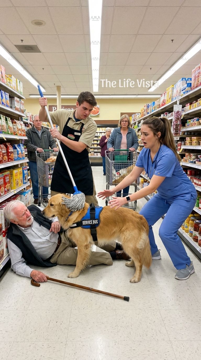 The store manager roughly kicked aside a battle-worn service dog as its veteran handler collapsed—unaware that the loyal animal wasn’t causing trouble, but urgently trying to save the very life slipping away before them.