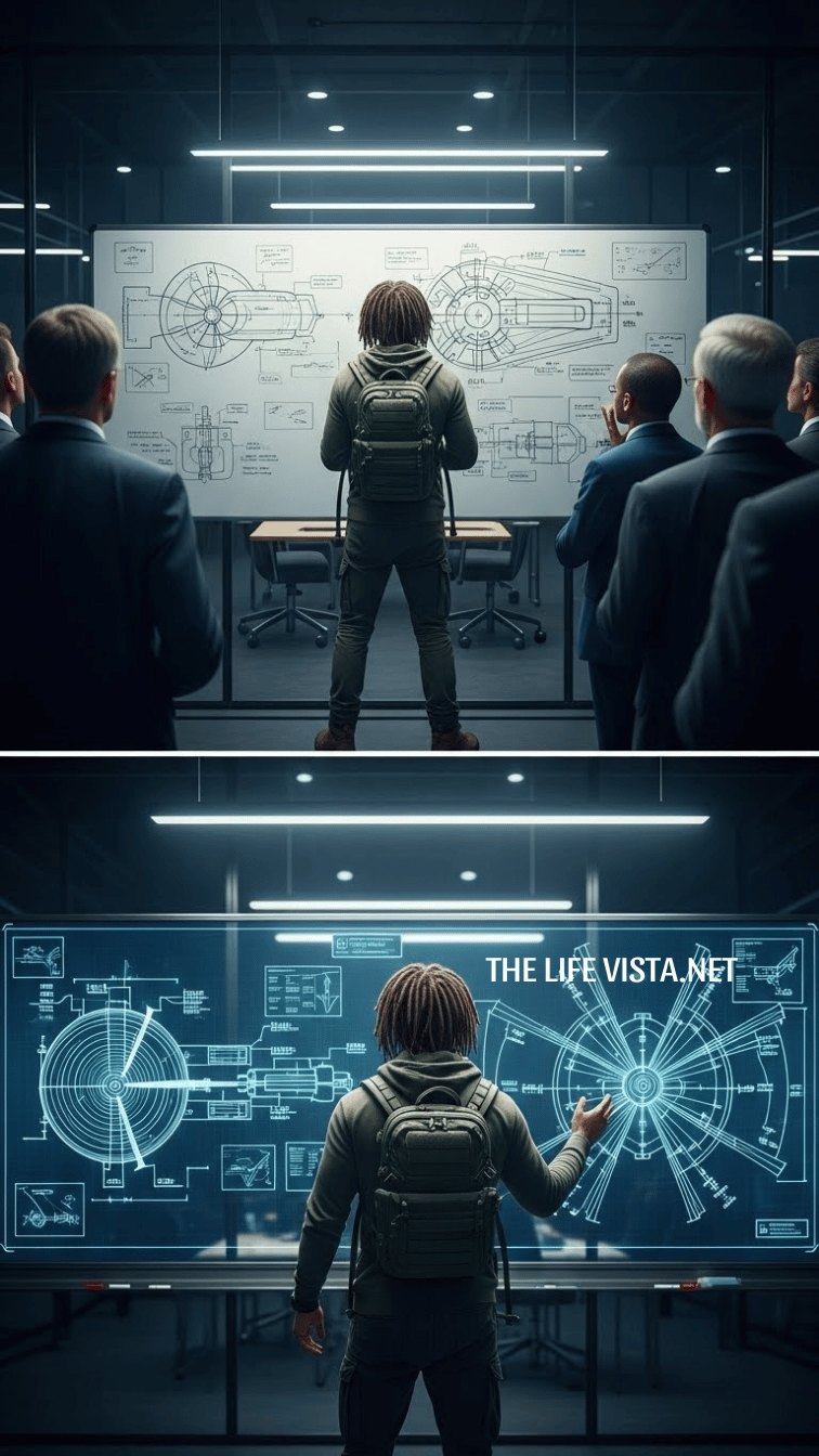 The man held his gaze. “I said I can fix it.” Silence returned. But this time it was a different kind of silence. An awkward silence, heavy with disbelief. “You,” a young female engineer blurted out, arms crossed. “And what do you know about us?” “I didn’t come here to talk, miss,” he replied calmly. “I came to fix it.” Richard sighed, glanced at his engineers who remained silent, and then slowly pushed the marker across the table toward the stranger. “If you waste my time, you’ll waste more than that,” he said emotionlessly. “Go ahead.” Some snorted. One muttered, “This is a joke.” But no one dared to stop him. The stranger walked calmly to the front. He smelled of earth, of old paper, and of homelessness. He didn’t ask permission, he didn’t explain anything, he just picked up the marker, stared intently at the board, and remained still for three long seconds. And then he began to erase, first two contradictory arrows on the right wing, then a duplicate formula, then he drew a single curved line, smooth as a river.