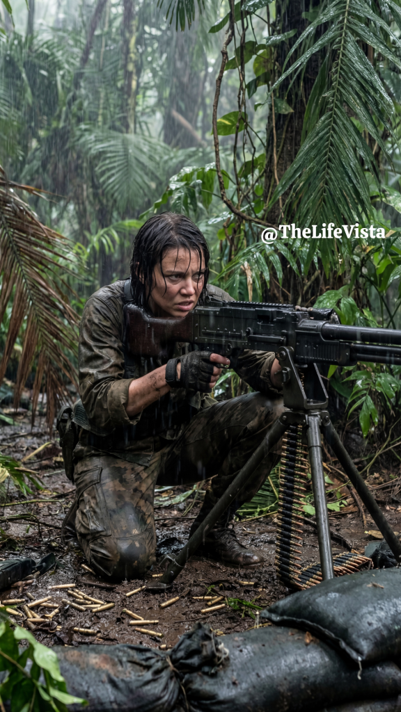 A heartbeat later, it roared back to life, ripping through cartel positions instead of Marine lines. Rourke stared in disbelief as the weapon turned inward, cutting down its own operators. Through the smoke and rain, he saw a lone figure controlling the gun with deadly precision.