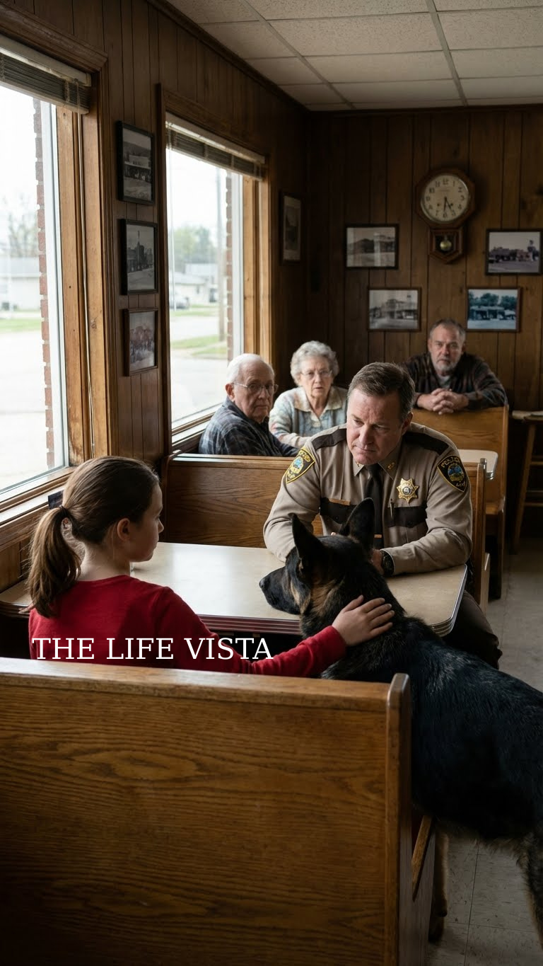 In the far corner of the diner, a small girl in a red shirt and ponytail stared at him with wide, thoughtful eyes. Beside her sat a massive German Shepherd, quiet and alert, his gaze fixed on the officer as if studying him. The girl stood up. She wasn’t more than ten.