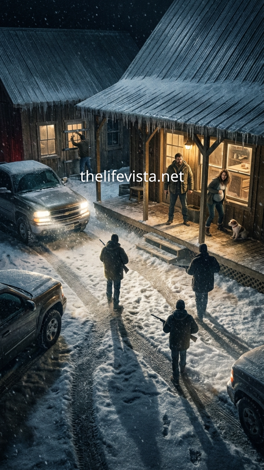 Sleet hammered the tin roof of a cabin outside Cedar Falls, Iowa. Emily Carter, eight months pregnant, clutched her small terrier, Max, tightly against her chest. The long gravel driveway vanished into a wall of trees and darkness.