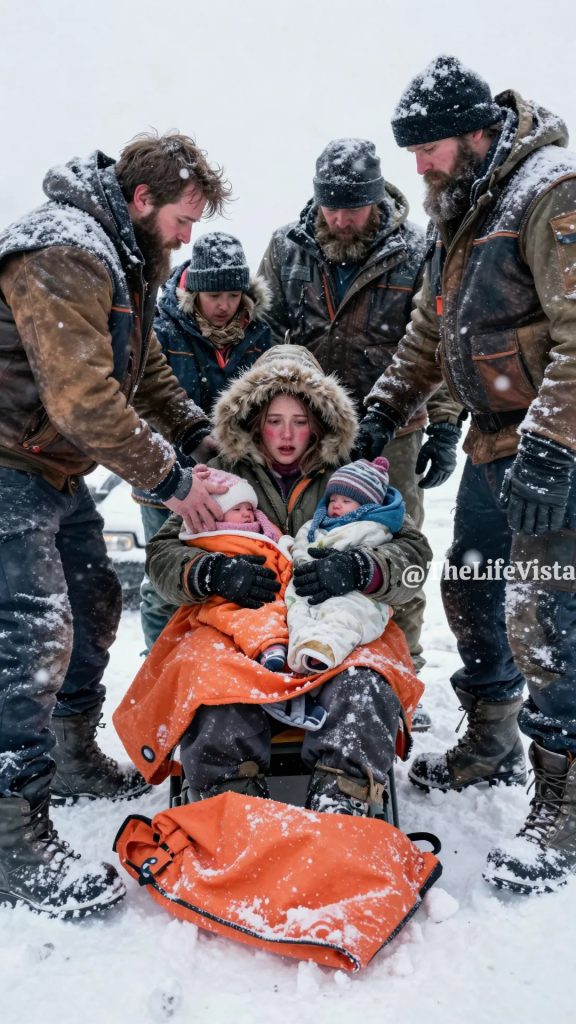 The man tapped the window once, not with impatience but with a steady request. When Adriana met his eyes, his posture changed, sudden and sharp, because he saw the babies pressed to her chest. The predatory stillness vanished, replaced by urgency that felt almost furious. He gestured to a younger rider with quick hands, and together they gripped the door handle. They did not politely tug, and they did not ask if the snow allowed it; they wrenched with brutal certainty until the packed drift gave way with a grinding scream. The door groaned open, metal protesting, and a blade of cold air sliced into the cabin so hard it stole Adriana’s breath.