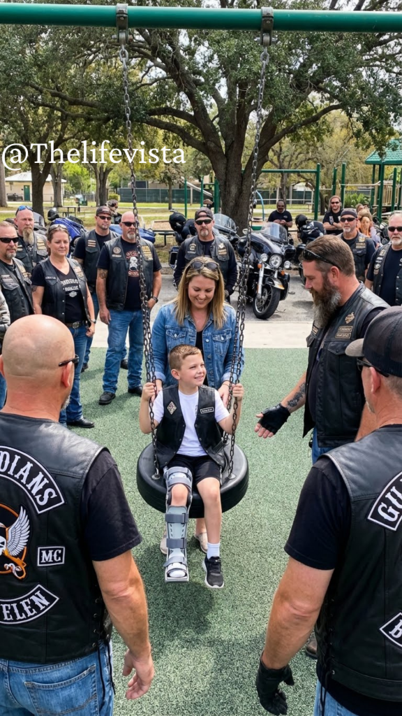 Around them, parents exchanged glances. Some were embarrassed, some were inspired. They had seen what silence cost and what courage could give. As the evening breeze swayed the swing, Tyler lifted his face toward the sky. The roar of engines still echoed in his memory, steady as a heartbeat. And though the bikers were gone, he knew he would never stand alone again.