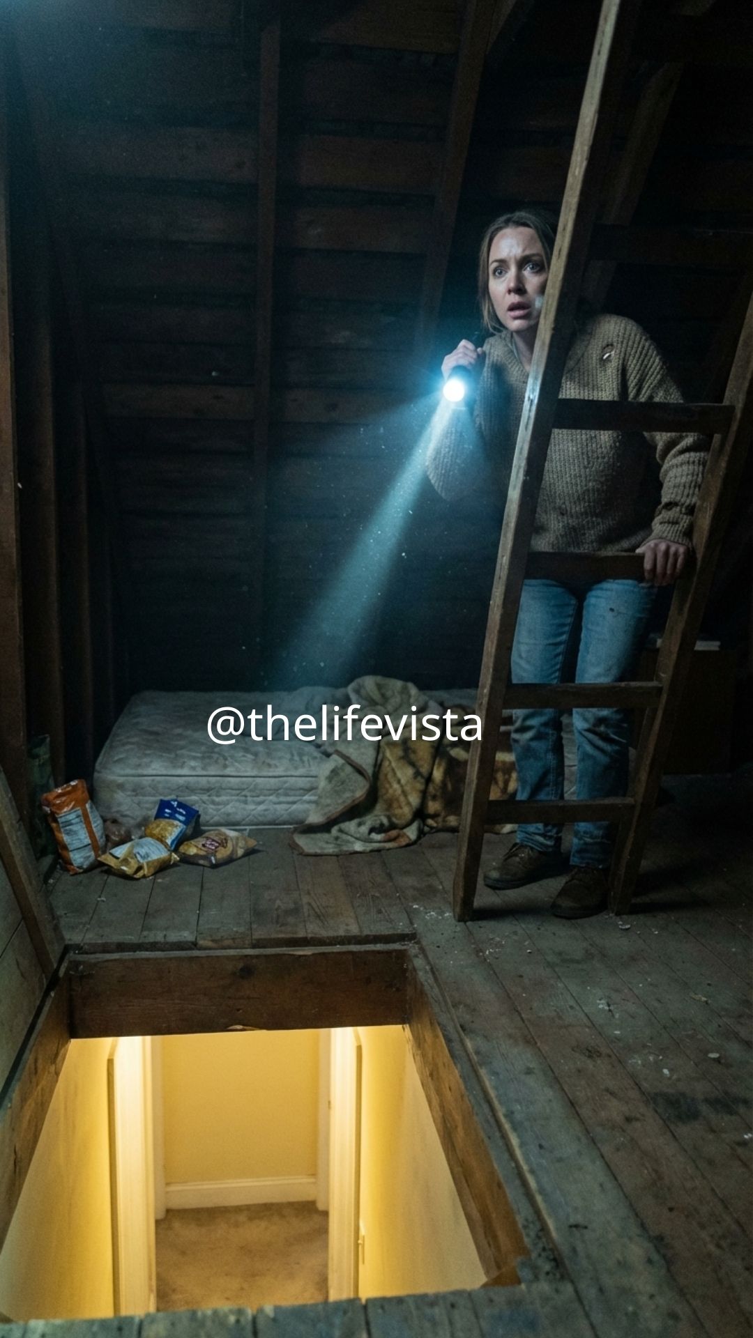 Still, at 2:00 a.m., flashlight in hand and heart pounding with a mixture of dread and disbelief, I pulled down the attic ladder. The wood creaked louder than it ever had before, and each step felt like climbing toward something I didn’t want to see but couldn’t ignore. Upstairs, in the dim cone of light from my flashlight, I found a thin mattress pressed against the far wall, empty bottles scattered nearby, and food wrappers I recognized from our own kitchen trash.