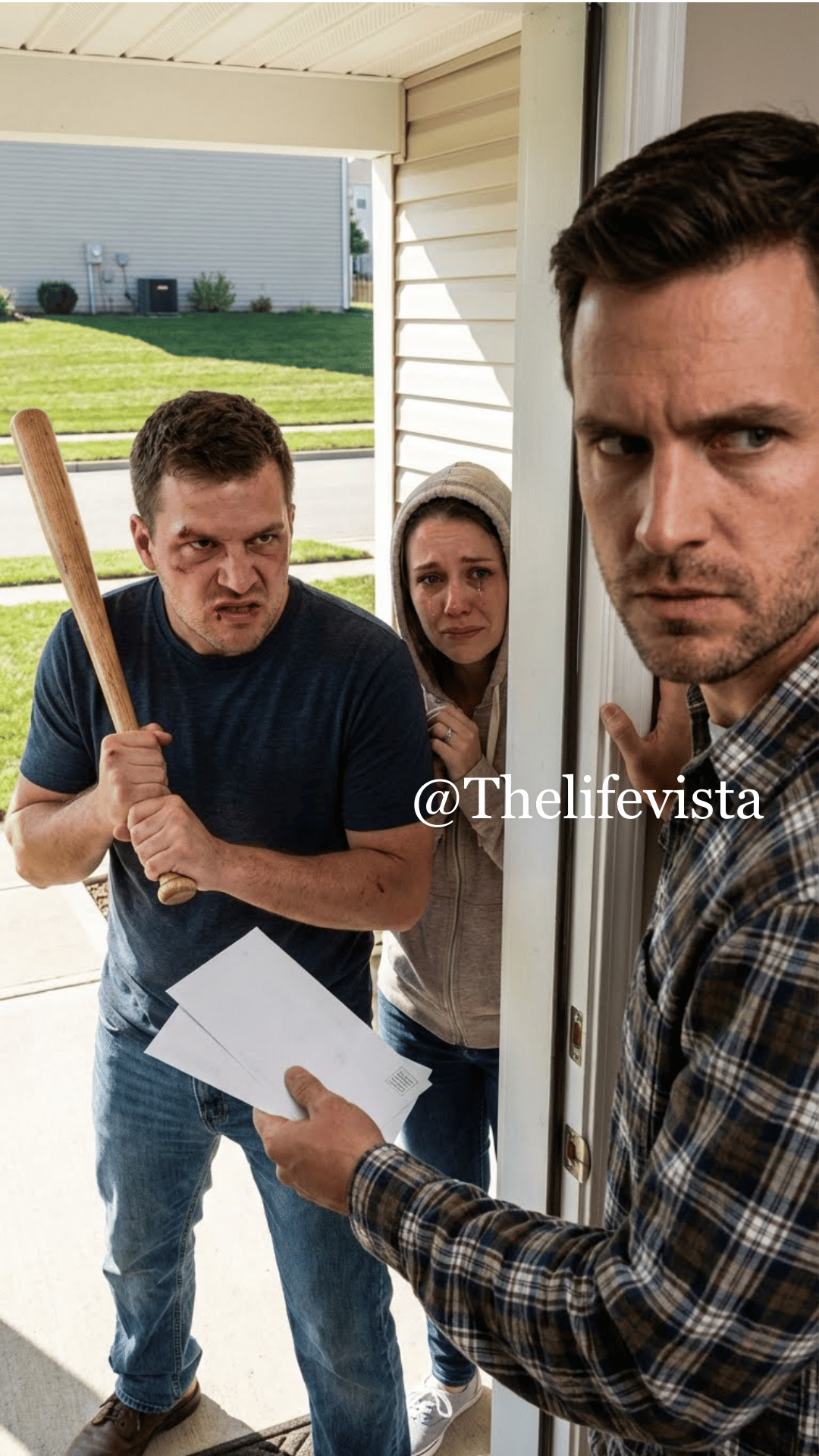 I finally opened the door, keeping my hands visible. “Because he brought a bat to my house,” I said. “Because you’re standing next to him.”