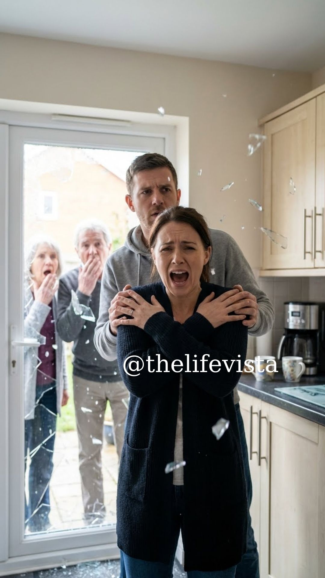 It wasn’t a nudge. It was a full-body, two-handed push that drove my shoulder into the glass. The world exploded—crack, shatter, a rush of cold air—then I was falling, my feet catching on the threshold. Pain flashed hot and white, and my vision smeared.