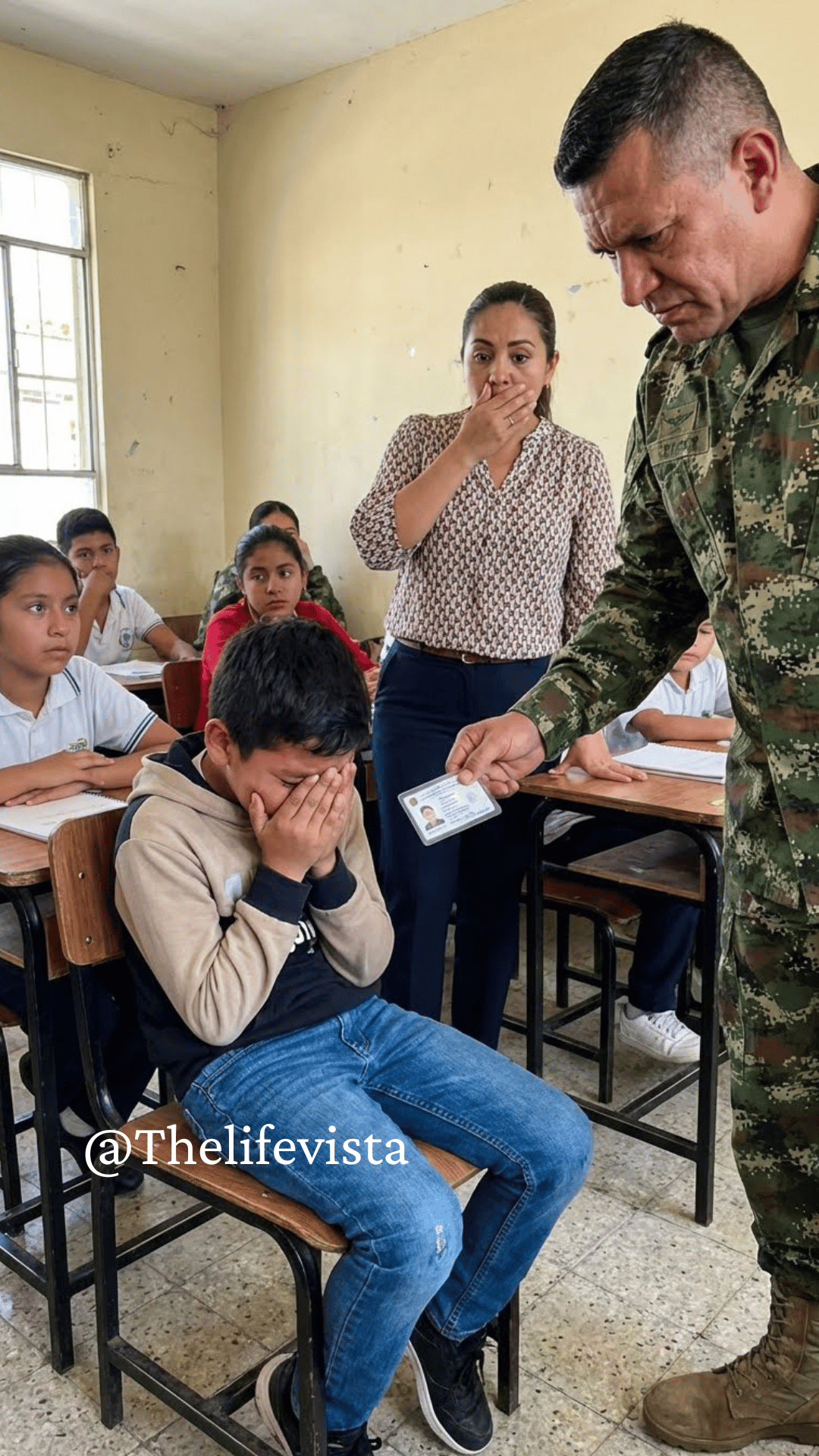 Ten minutes later, the hallway outside the classroom erupted with the unmistakable thud of heavy military boots. Several heads turned. The noise grew louder, sharper, more purposeful. When the classroom door swung open, a tall man in crisp military uniform stepped inside—his presence commanding instant silence.