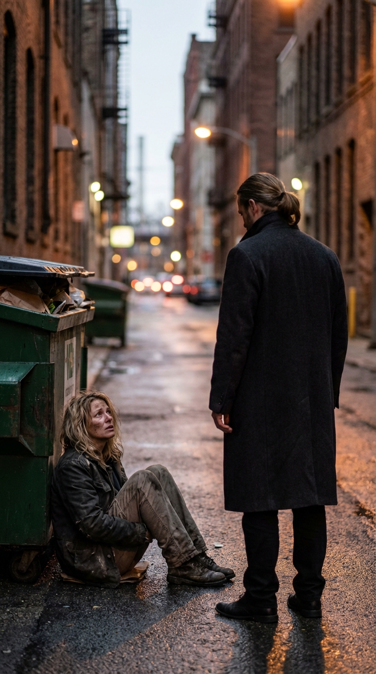 Three months later, I was kneeling behind a supermarket on West Fulton Street, digging through a dumpster with trembling hands. Hunger has a way of stripping away pride quietly. I hadn’t eaten properly in two days. My coat was too thin for November, and my hair smelled like rain and trash. I remember thinking that this—this silence, this invisibility—was how people truly disappeared.