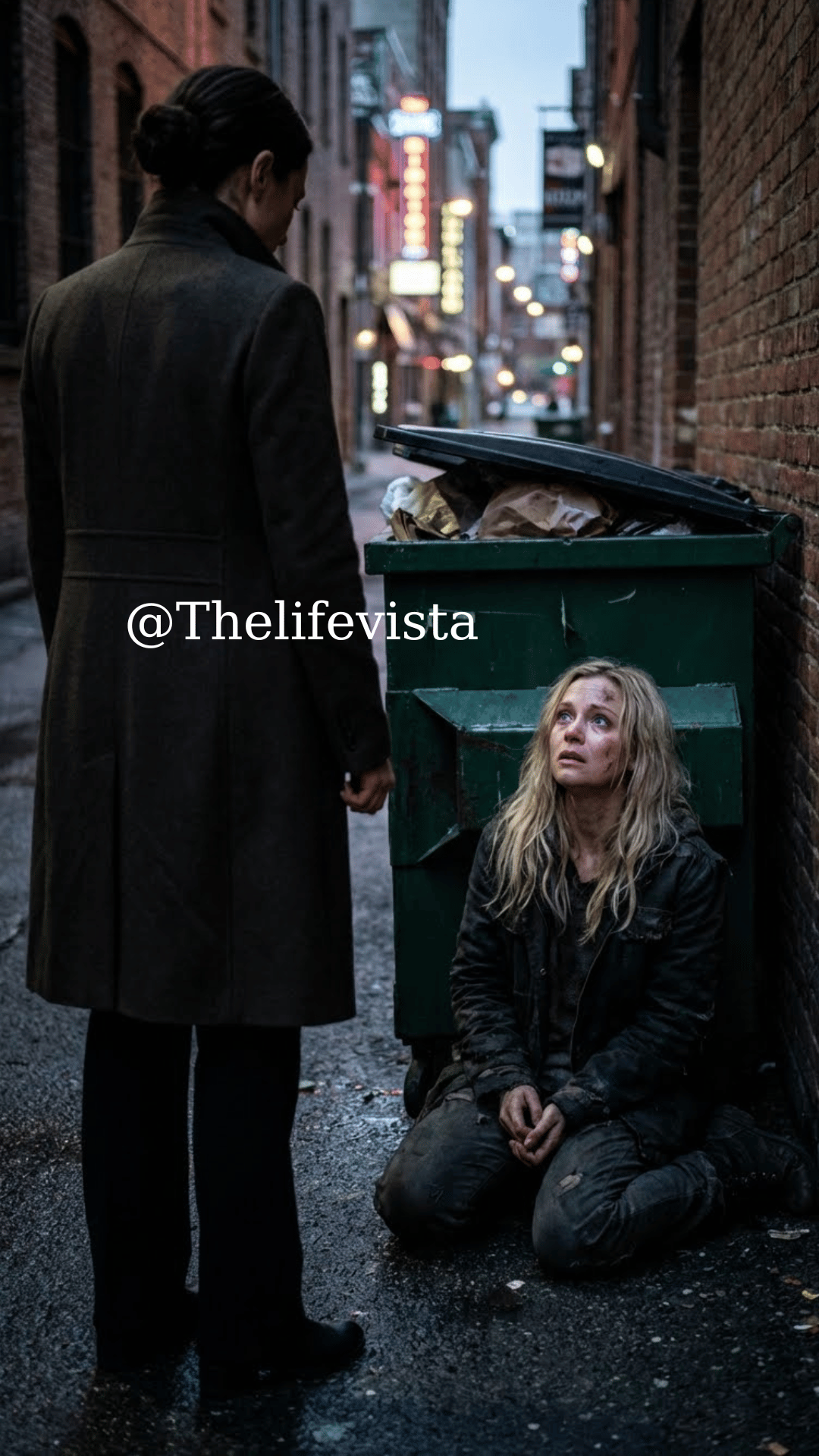 Three months later, I was kneeling behind a supermarket on West Fulton Street, digging through a dumpster with trembling hands. Hunger has a way of stripping away pride quietly. I hadn’t eaten properly in two days. My coat was too thin for November, and my hair smelled like rain and trash. I remember thinking that this—this silence, this invisibility—was how people truly disappeared.