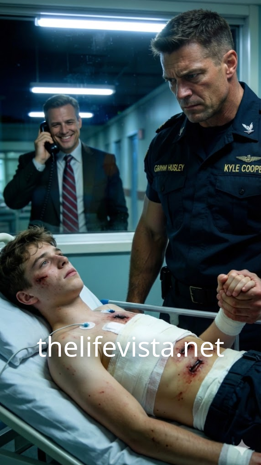 For a second, I didn’t even understand the words. Then my heart stopped in a way no training could fix. Our sixteen-year-old son—Ethan Cooper—quiet, stubborn, the kind of kid who carried pain like armor—was bleeding out on the floor of the home he shared with his mother and her new husband, Graham Huxley.