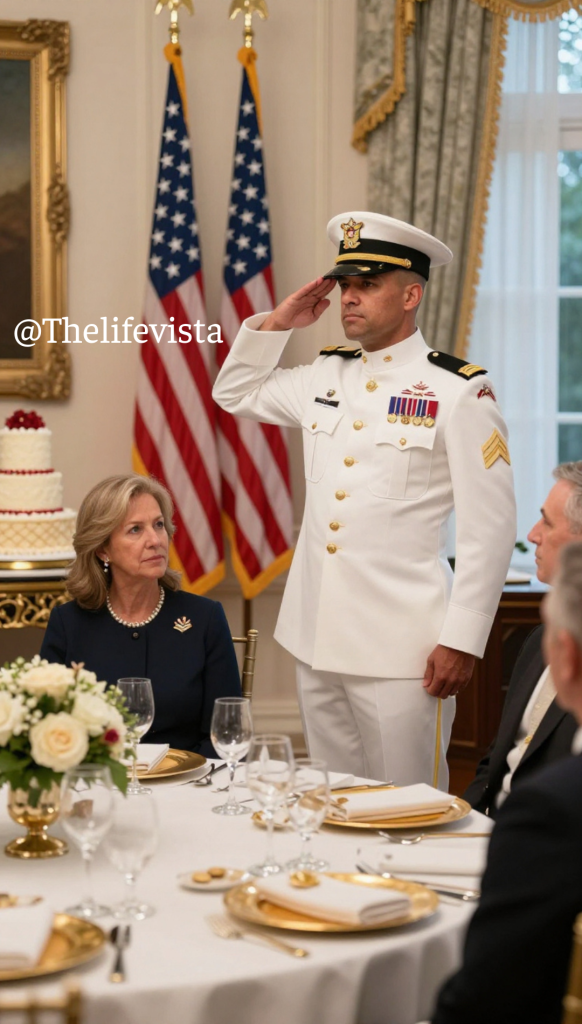 I stayed there quietly, sipping flat club soda, listening to conversations that didn’t include me. Dinner was called a few minutes later. People lined up by rank, almost subconsciously—military, family, extended guests. I waited near the back, filled my plate with small portions, and sat in the corner near the window. I tried to keep my head down—just survive the next hour, then leave.