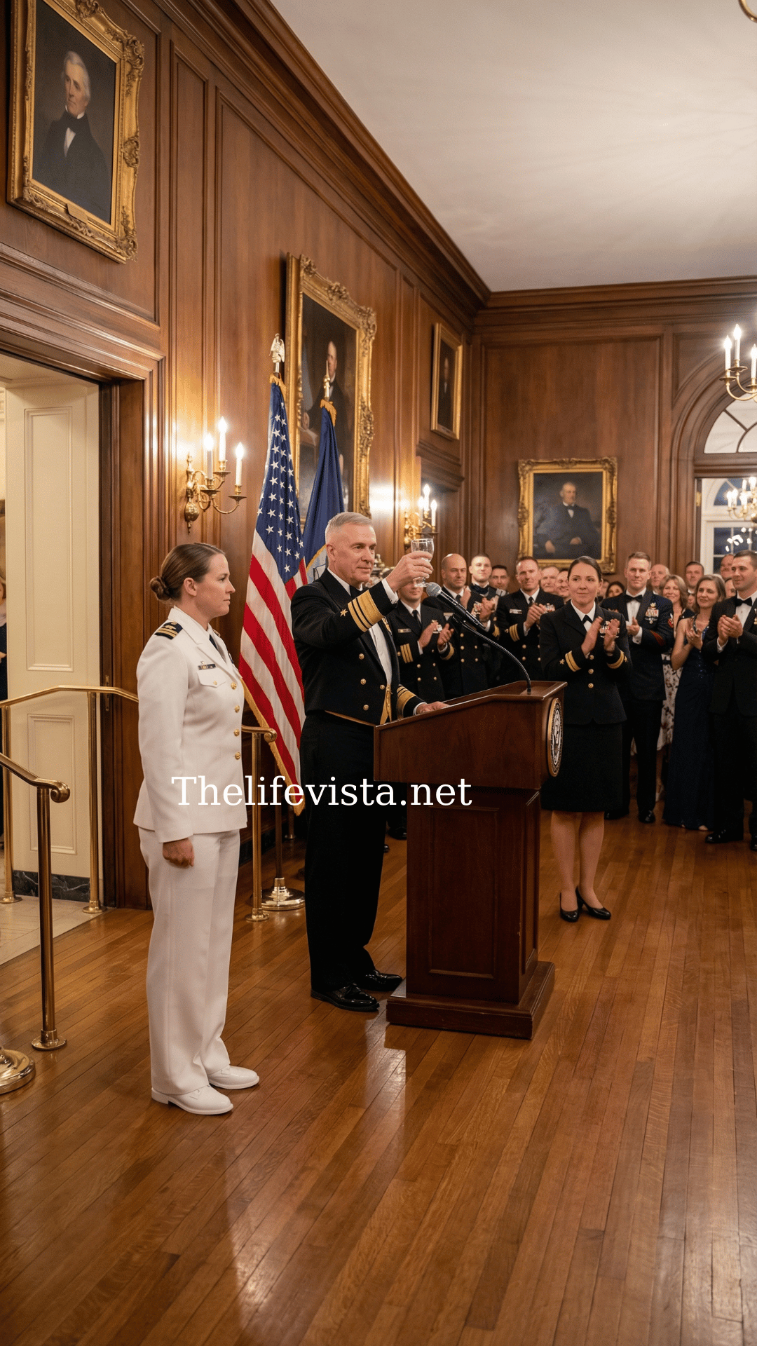 To my daughter Jessica,” he boomed, his voice echoing across the polished deck of his waterfront home, the youngest commander in the fleet. The crowd of officers and their families erupted in applause. But then the applause faltered. I had stepped out from the house, standing in my own service dress whites, the uniform crisp and immaculate.
