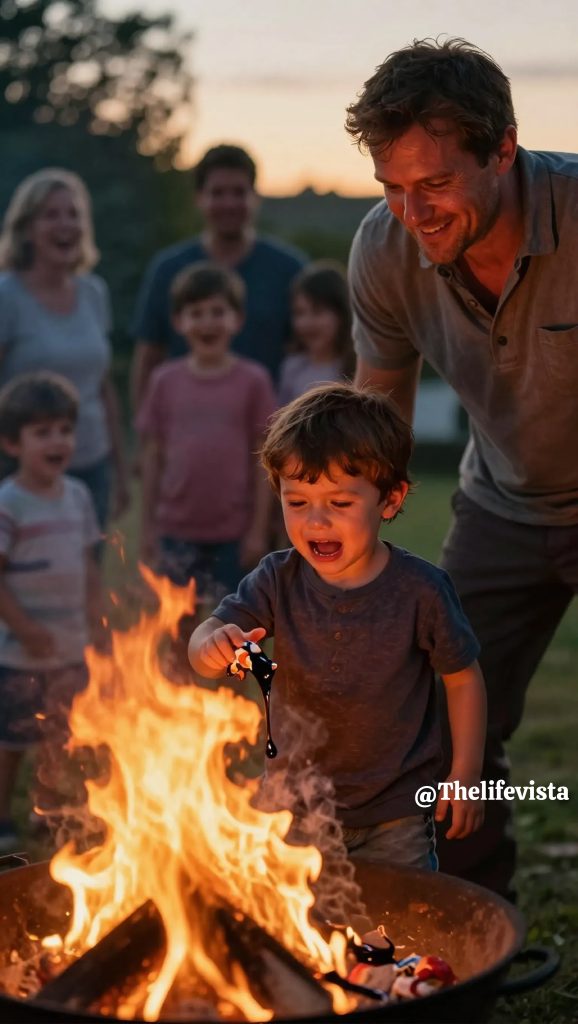 and people were gathering near the fire pit, I heard Lucas start crying. Not the tired, whiny cry, but the panicked, heartbroken one that makes every muscle in your body lock up. I ran toward the fire pit and froze. In the middle of the flames, blackened and melting, were Lucas’s toys, his little action figures he had been clutching all day.