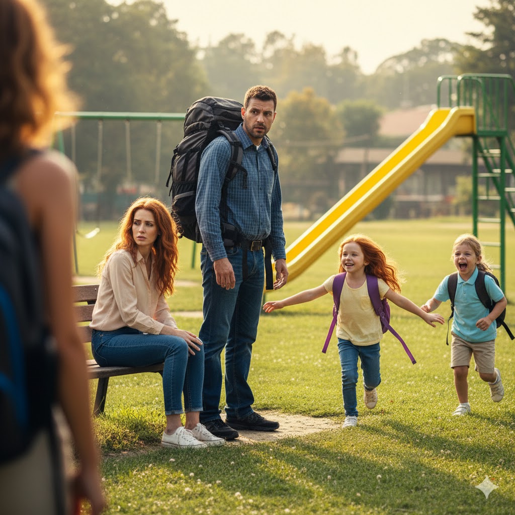 “Go play for a while,” Mark said tensely, pointing to the swings. The woman turned away, uncomfortable. Mark ran a hand through his hair and murmured,