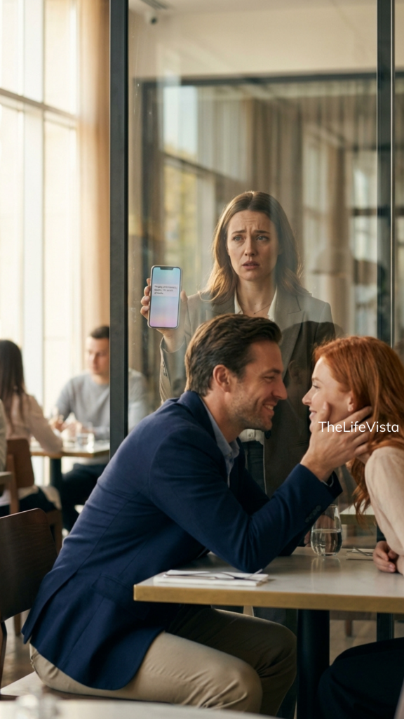 “I was having coffee at the counter,” she said, nodding toward the bar near the front where a half-empty ceramic mug still sat beside an open newspaper. “I come here sometimes on my days off. I saw him come in about 20 minutes ago. I saw her kiss him, and I saw your face through that window just now, and I knew exactly what you were about to do.”