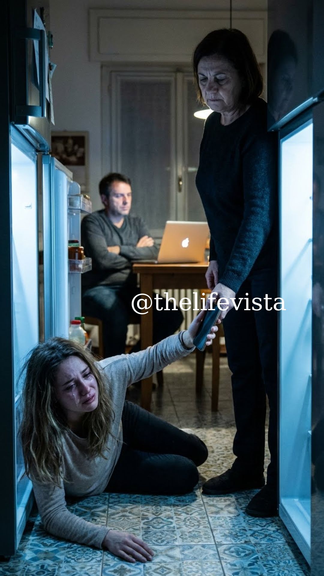 I felt the crunch before the pain. Warm blood poured down my lips and chin, dripping onto my shirt. I screamed, not from fear, but shock. My knees buckled. I slid down the fridge, trembling, my vision blurring as my nose throbbed like it was on fire.