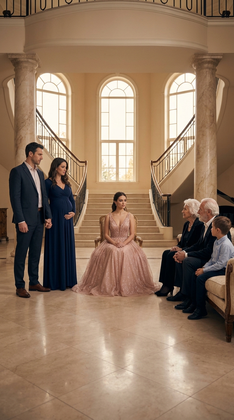 She rested one hand across her stomach in a gesture that appeared almost ceremonial, as if the unborn child she claimed to carry served as a crown granting her sudden authority in a room that had never belonged to her.