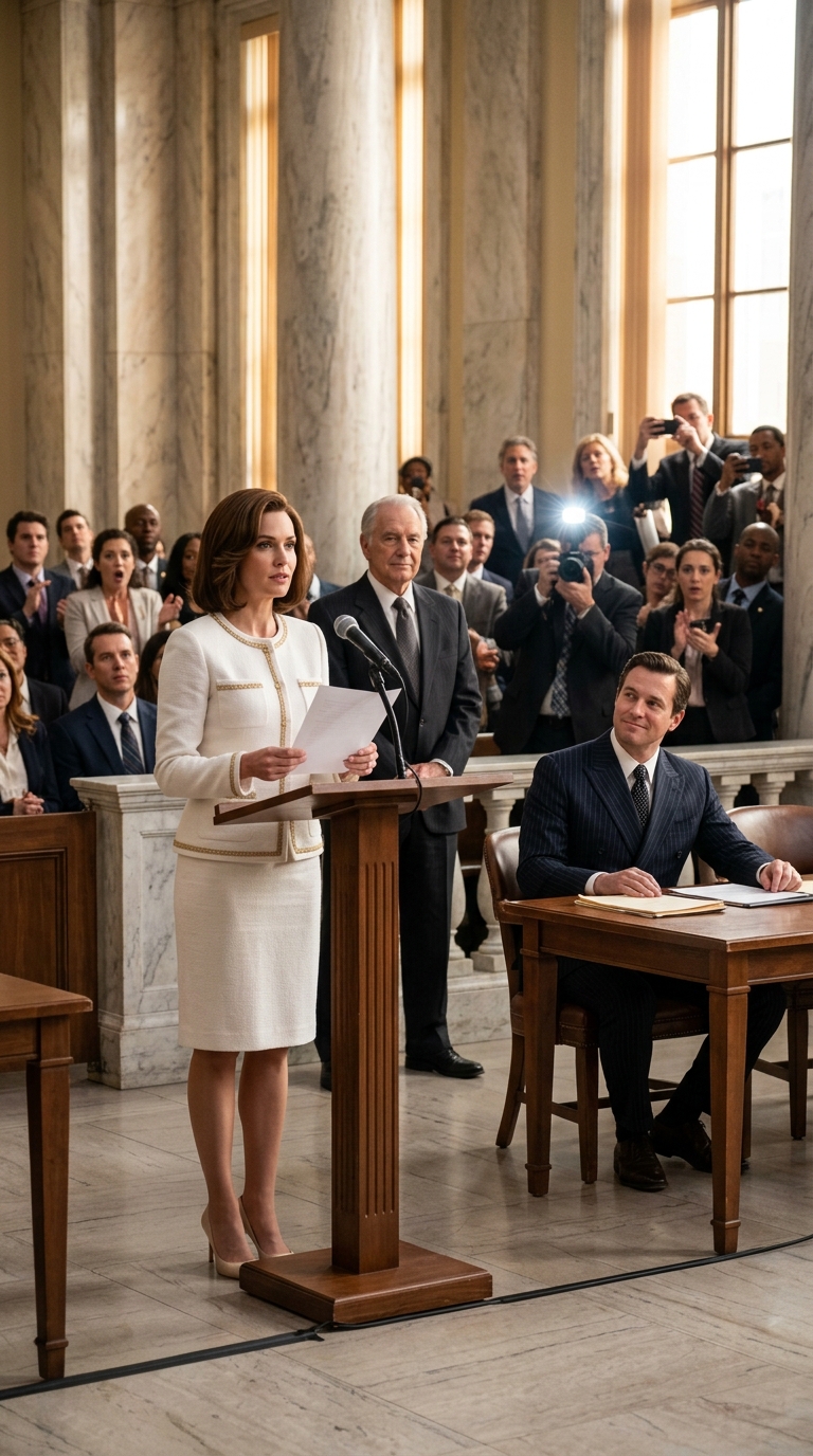 The courtroom grew still as she stepped forward, her calm voice carrying through the chamber without the need for raised volume.