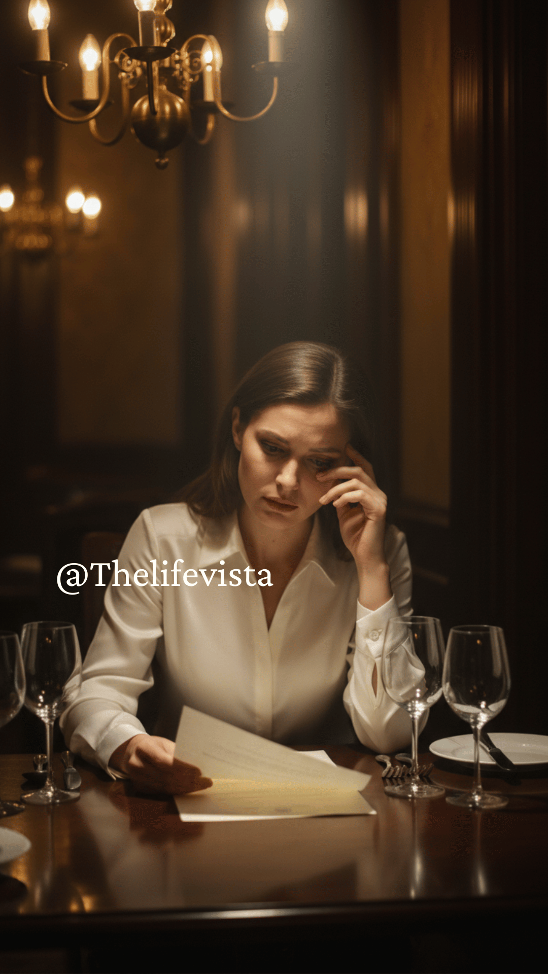 No Ethan. No in-laws. No waiter. Just a beautifully set table with one chair pulled out, as if for a single guest.