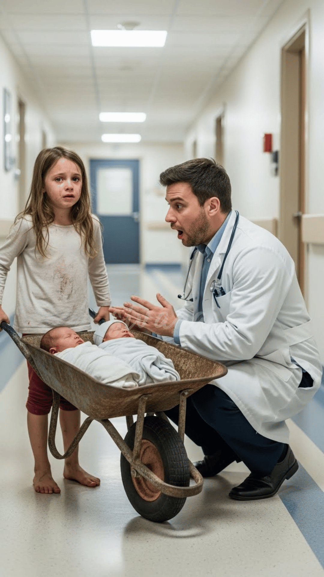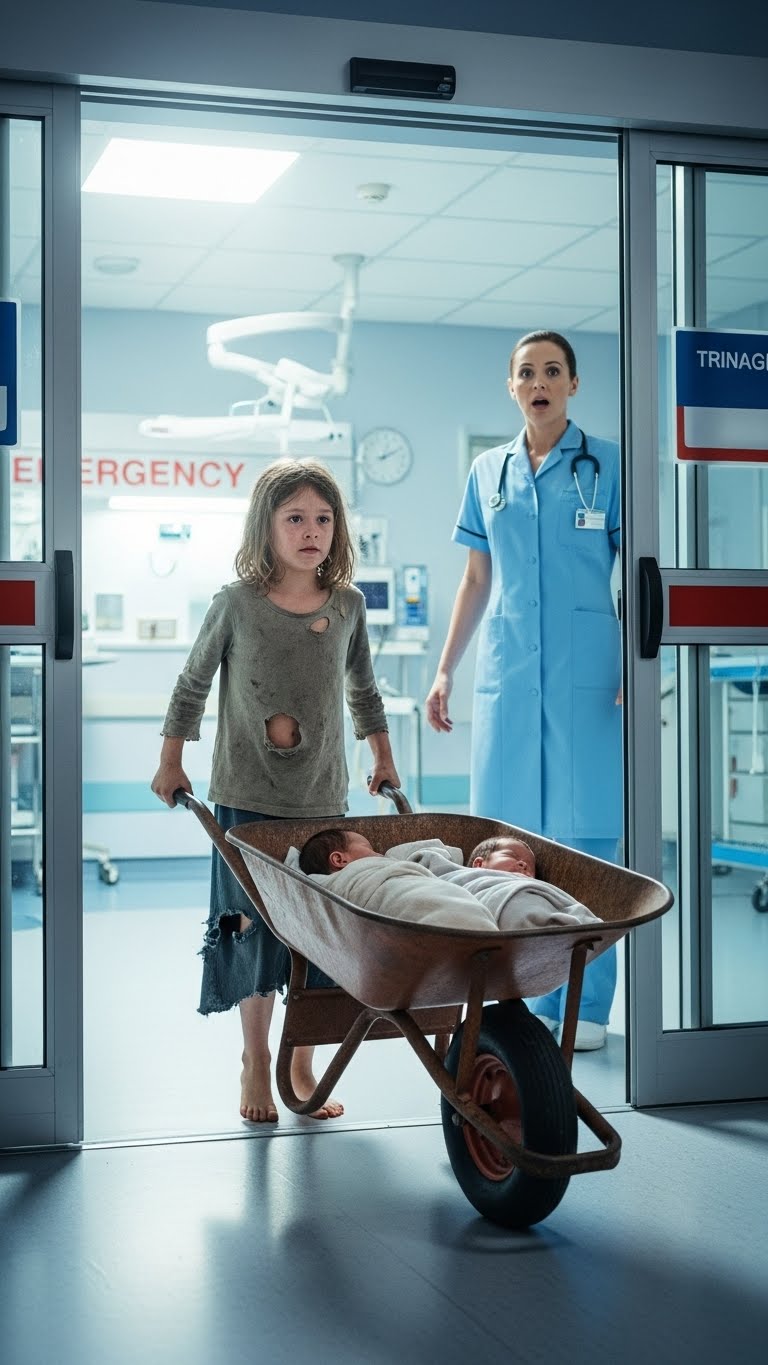The emergency room at St. Mary’s County Hospital had seen its share of chaos, but nothing quite like this. When the automatic doors burst open that morning, the triage nurse froze. A girl — no more than seven — was pushing a rusted wheelbarrow through the doorway. Inside, wrapped in a thin blanket, were two newborns, their faces pale but breathing.