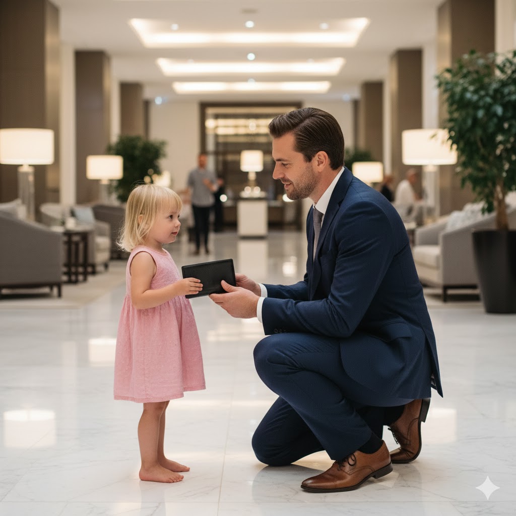 “I found this near the bus stop,” she said, offering it to him. “I saw your name inside. My mom taught me not to keep what isn’t mine.”