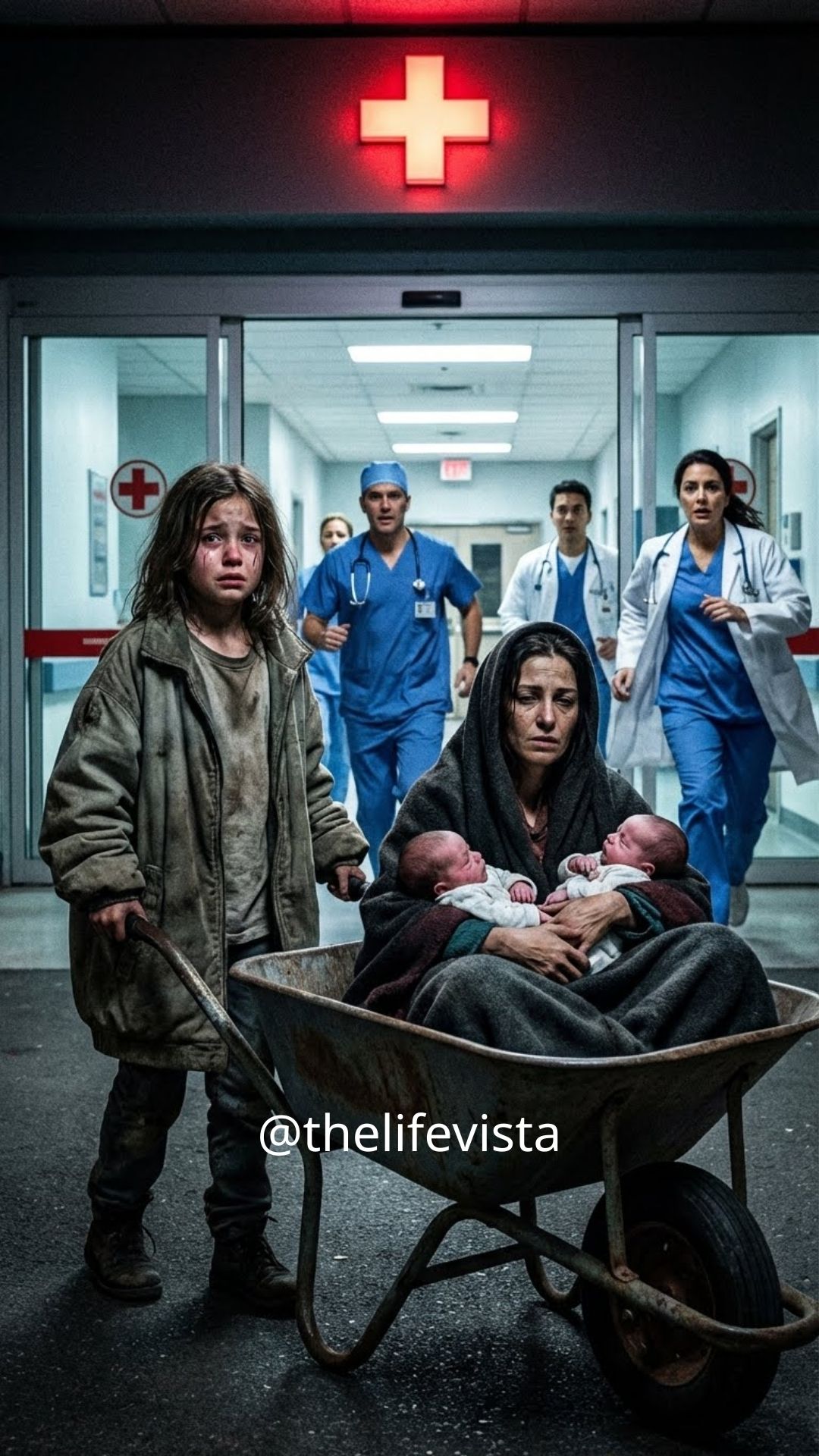 The nurse froze mid-step as the small voice echoed through the emergency room. A seven-year-old girl stood just inside the sliding doors, hands clenched around the handles of a rusty wheelbarrow. Her hair was tangled, her sneakers worn thin. Inside the wheelbarrow lay a woman, pale and unmoving, wrapped in a blanket. Beside her were two tiny bundles—newborn twins, barely bigger than loaves of bread.