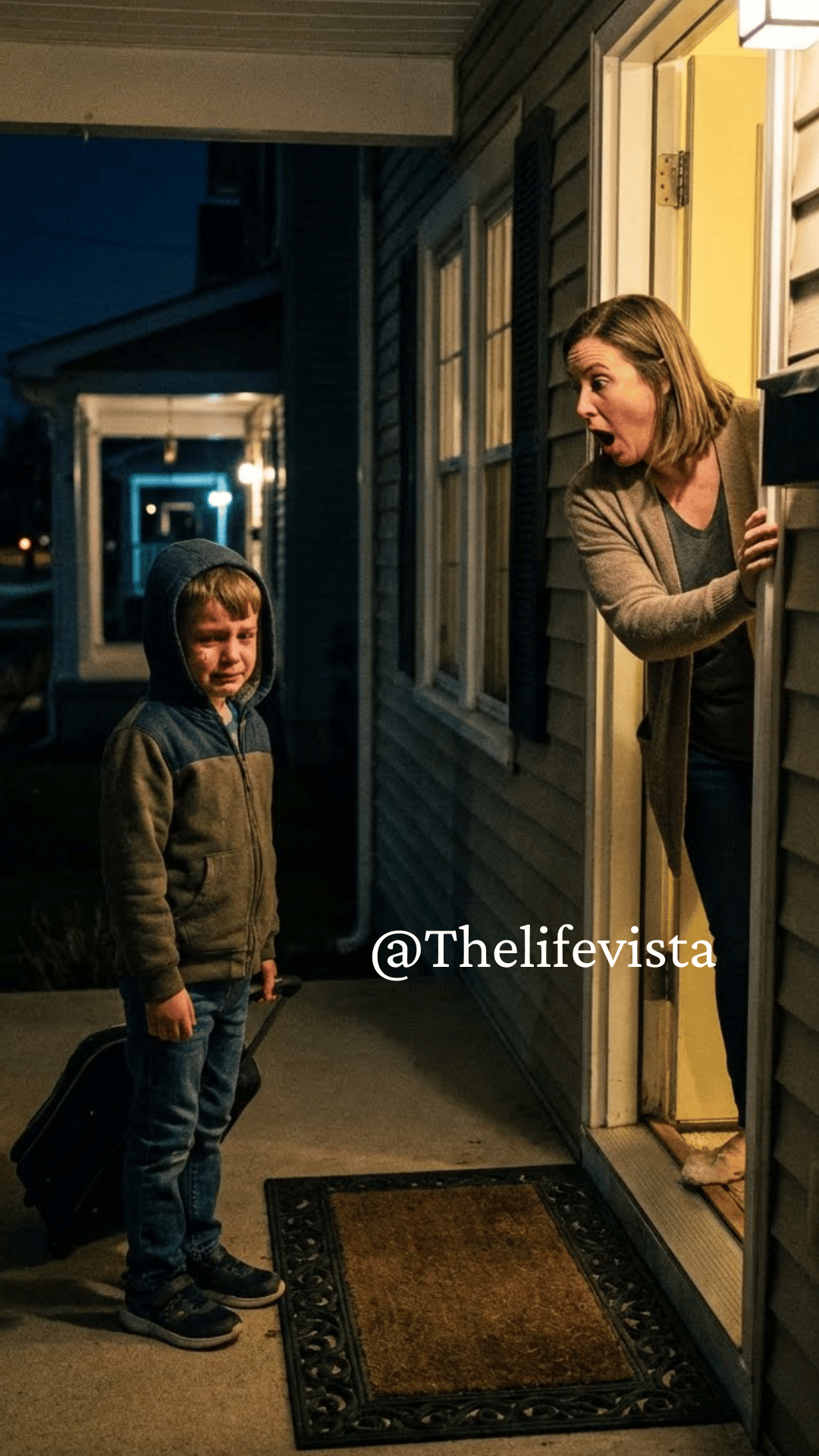 When I opened it, Noah stood there alone. His eyes were red and swollen from crying. One hand dragged a small blue suitcase across the porch.