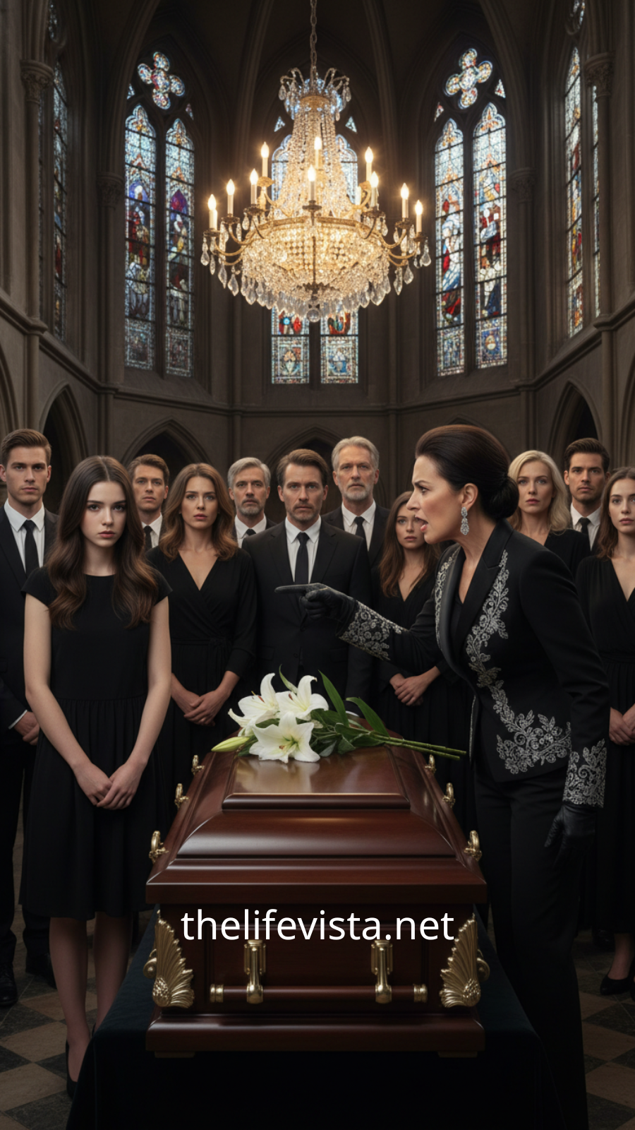 After the burial, the family gathered in the estate reception hall, where crystal chandeliers held old light and polished floors remembered arguments long buried under wealth. There, everything began to unravel.