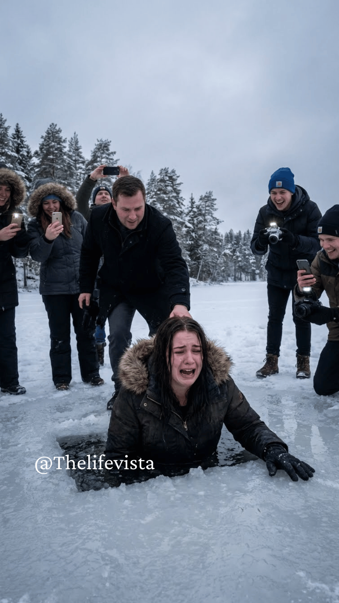 The shock hit her lungs like a punch. She gasped, clawing at the edge, but icy chunks kept breaking beneath her hands. The cold burned through her clothes, through her skin, through every frantic breath she fought for. Above her, instead of concern, she heard laughter—shrill, hysterical laughter.