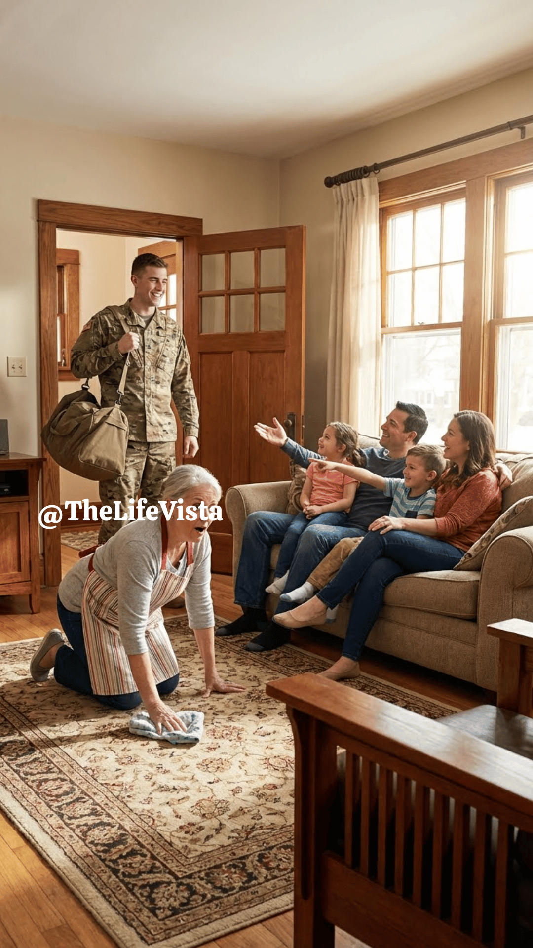 My hand froze mid-wipe. My heart slammed against my ribs so hard I saw spots. I turned slowly, terrified of the look I’d find on my son’s face. Nathan stood in the doorway in full uniform, deployment duffel still strapped over his shoulder, dust from foreign soil clinging to his boots. He hadn’t even taken a breath inside before his eyes locked onto me, kneeling, shaking, wearing an apron that didn’t belong to me, holding a rag that wasn’t mine.