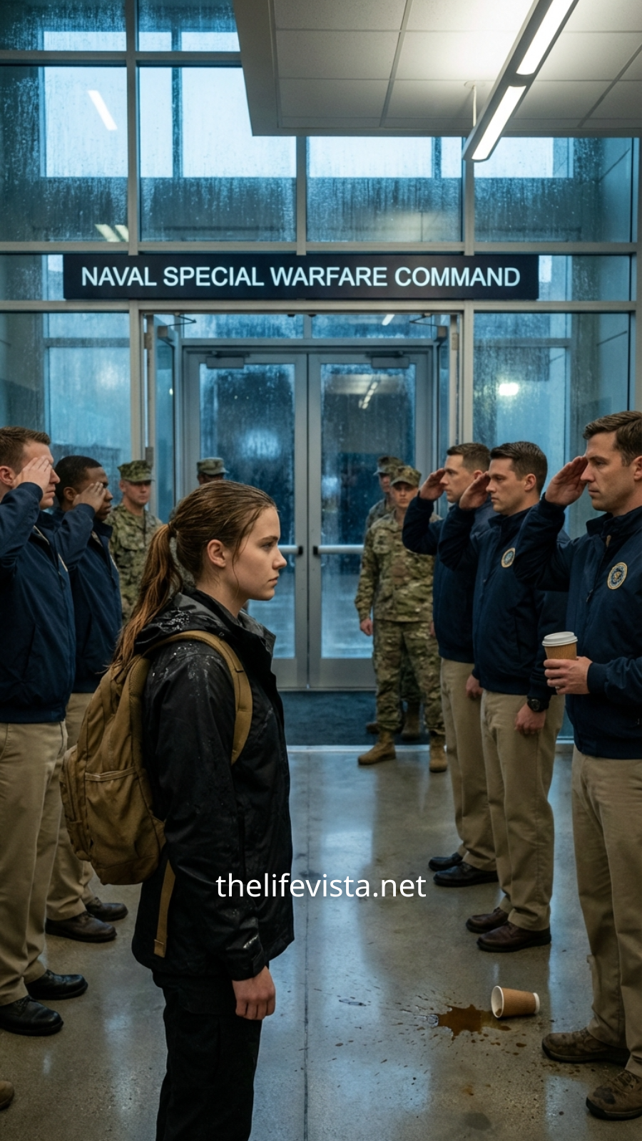 The torrential rain lashed against the Naval Special Warfare Command in Coronado, turning everything beyond the reinforced glass into a hazy gray blur. From his position on the second floor, Commander Jake Matthews observed the main entrance with the detached fatigue of a man drowning in endless administrative work. It was just another Tuesday—the most uneventful day of the week—until the automatic doors slid open, and in that instant, the entire atmosphere inside the building shifted.