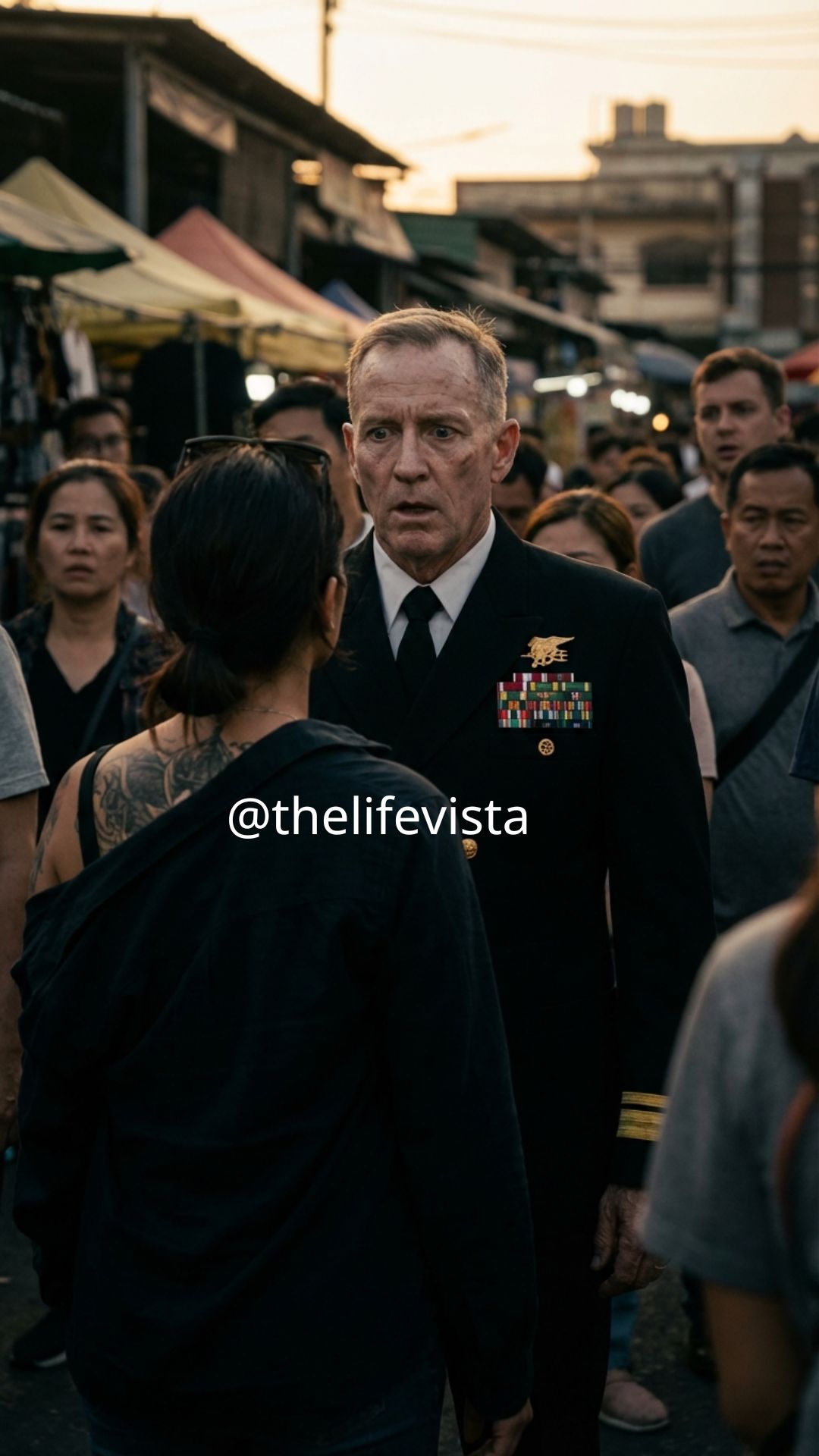 A group of high-ranking officers was making the rounds, shaking hands with the new graduates and their families. Leading the pack was a Commander. He was tall, his face weathered like carved stone, chest heavy with ribbons. He carried an aura of absolute authority. The crowd naturally parted for him.