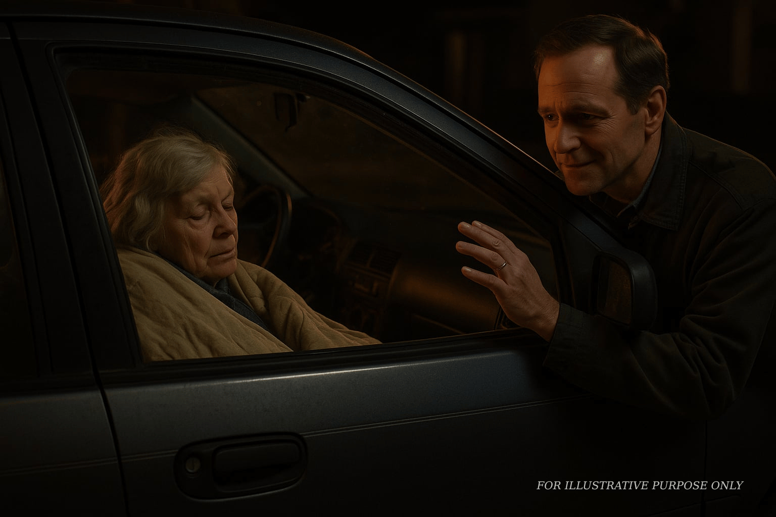 Alarmed, David walked over to the old vehicle and peeked inside. The sight that greeted him was unsettling. There, in the front seat, was Mrs. Madison, curled up under a thick comforter, dozing away. The back seat was neatly packed with boxes—groceries, toiletries, and basic supplies. It was clear: Mrs. Madison was living out of her car. But why?