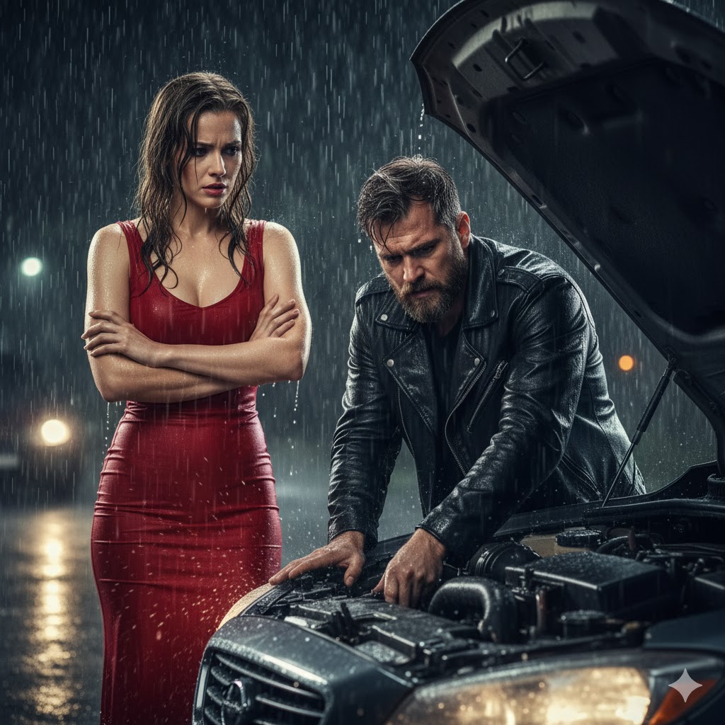 A red luxury sedan sat on the shoulder of Maple Avenue, its driver’s door open. A woman stood beside it, shoulders hunched against the downpour, one hand pounding at a phone. The kind of car that cost more than Mason would earn in five years. The kind of person who probably had roadside assistance on speed dial.