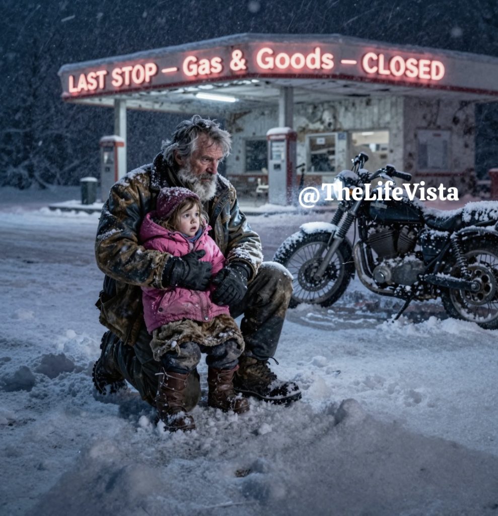 Jack “Iron Wolf” Harrington had been riding south toward Phoenix after visiting his granddaughter in Flagstaff when the storm swallowed the highway without warning, its fury forcing even the most experienced riders to reconsider their limits. At fifty-six, Jack had led the Desert Riders Motorcycle Club for more than two decades, surviving desert heatwaves, relentless storms, and countless long rides through hostile terrain, but even he recognized that this was no ordinary snowfall. This was the kind of storm that could bury vehicles, erase landmarks, and turn confidence into a liability. When his Harley began to drift beneath the weight of the wind, Jack made the decision to pull off Highway 17 near the small mountain enclave of Timber Pines, desperately scanning the darkness for any shelter that might still be standing. The local gas station, once a haven for travelers, sat abandoned, its lights dark, its doors locked, its pumps frozen in place like silent witnesses to the storm’s power. He parked beneath the awning, the roar of his engine fading into the howl of the wind, and weighed the danger of attempting the seven-mile ride to the nearest hotel against the deadly certainty of the cold.