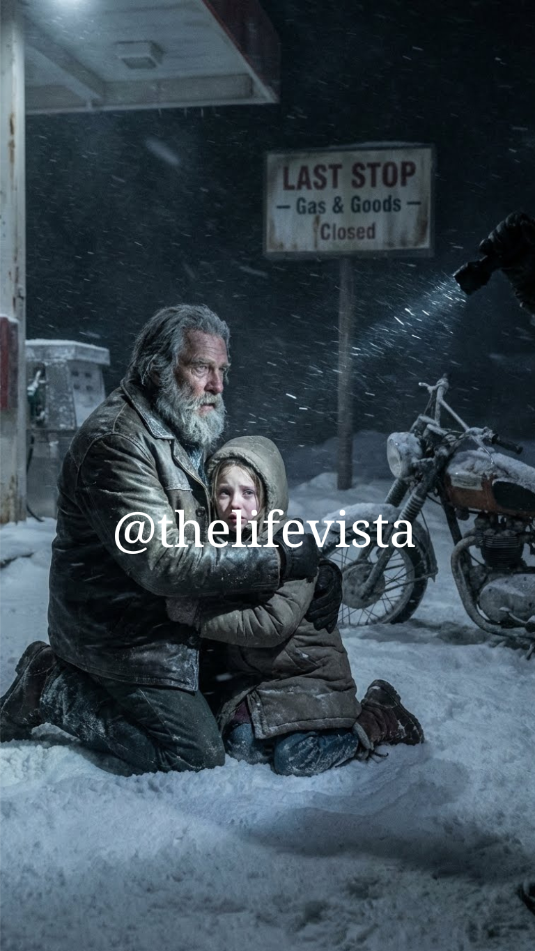 He kicked open the gas station’s locked door, glass shattering with a crack that echoed through the storm. Ignoring the sound, he carried her inside, her tiny frame trembling against his chest. The building was cold but offered refuge, the residual warmth from the day barely enough to ease the deadly chill.
