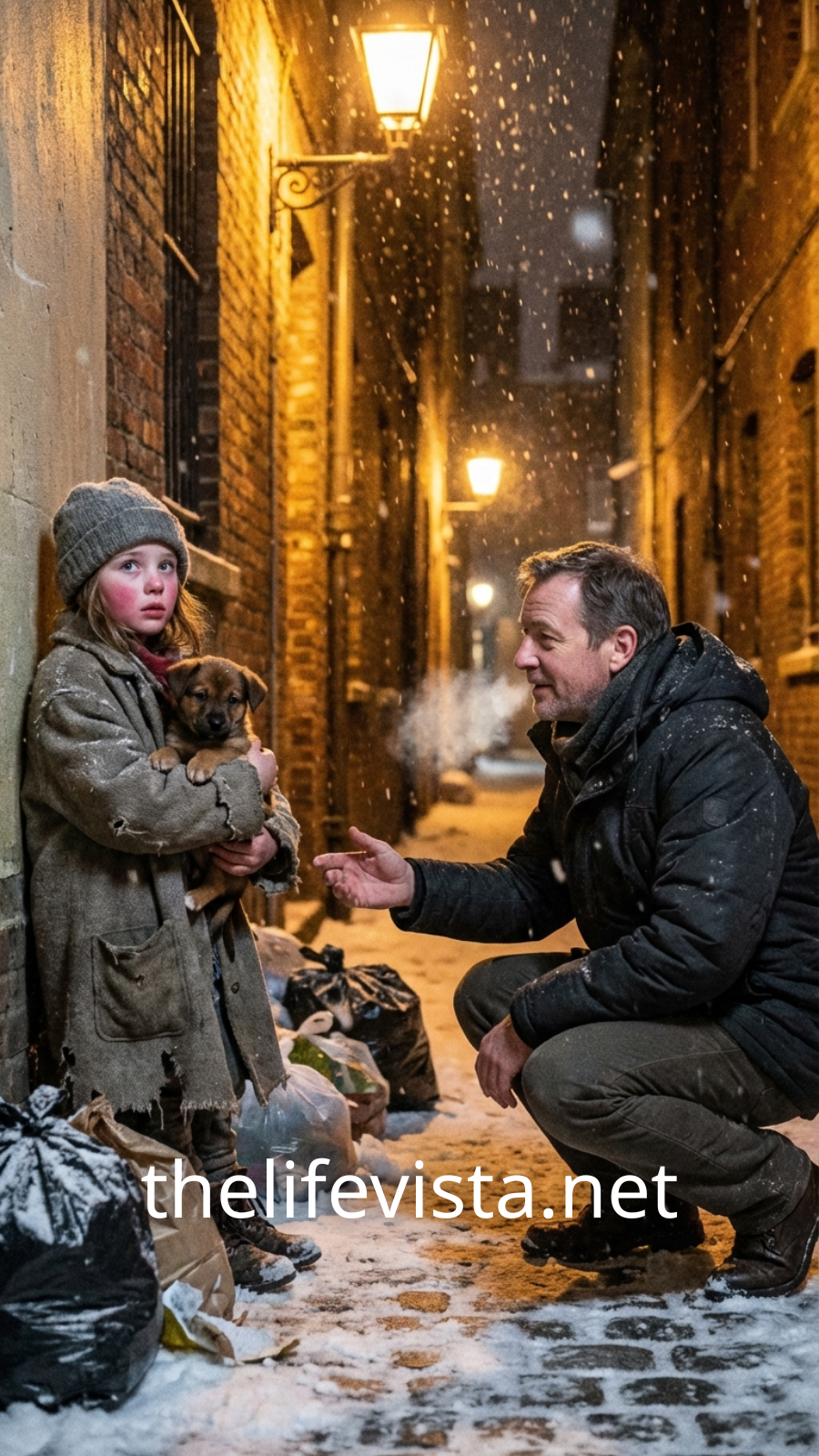 She couldn’t have been more than seven years old. Her thin body was curled tightly beside torn cardboard boxes and black trash bags, using whatever scraps she could find as a shield against the freezing wind. Her hair was tangled and stiff with snow, her shoes soaked through, her small lips tinged blue. Pressed tightly against her chest was a small brown mutt with uneven fur, his ribs faintly visible beneath his coat.