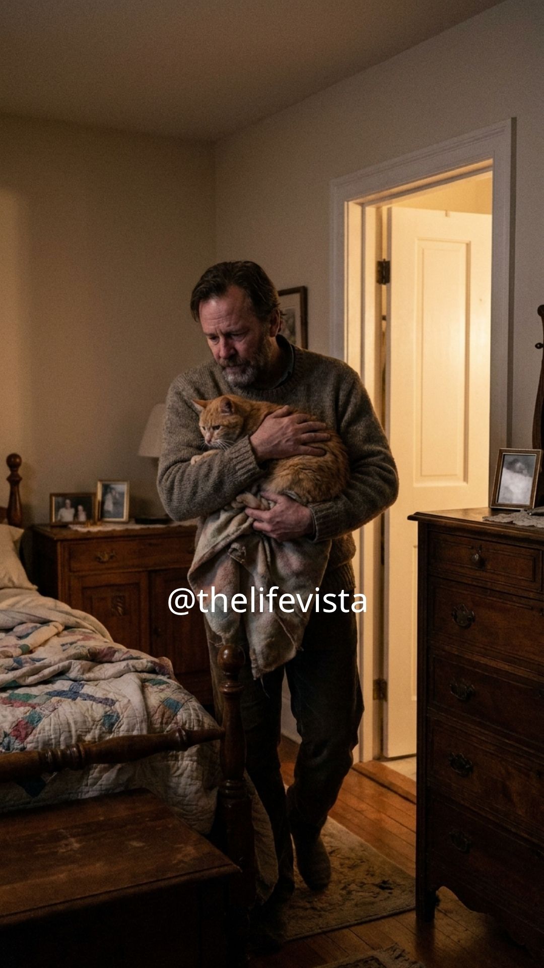 When I carried him into the bedroom, my father turned his head just slightly. His eyes were tired, almost gone—but when he saw the cat, something in them changed.