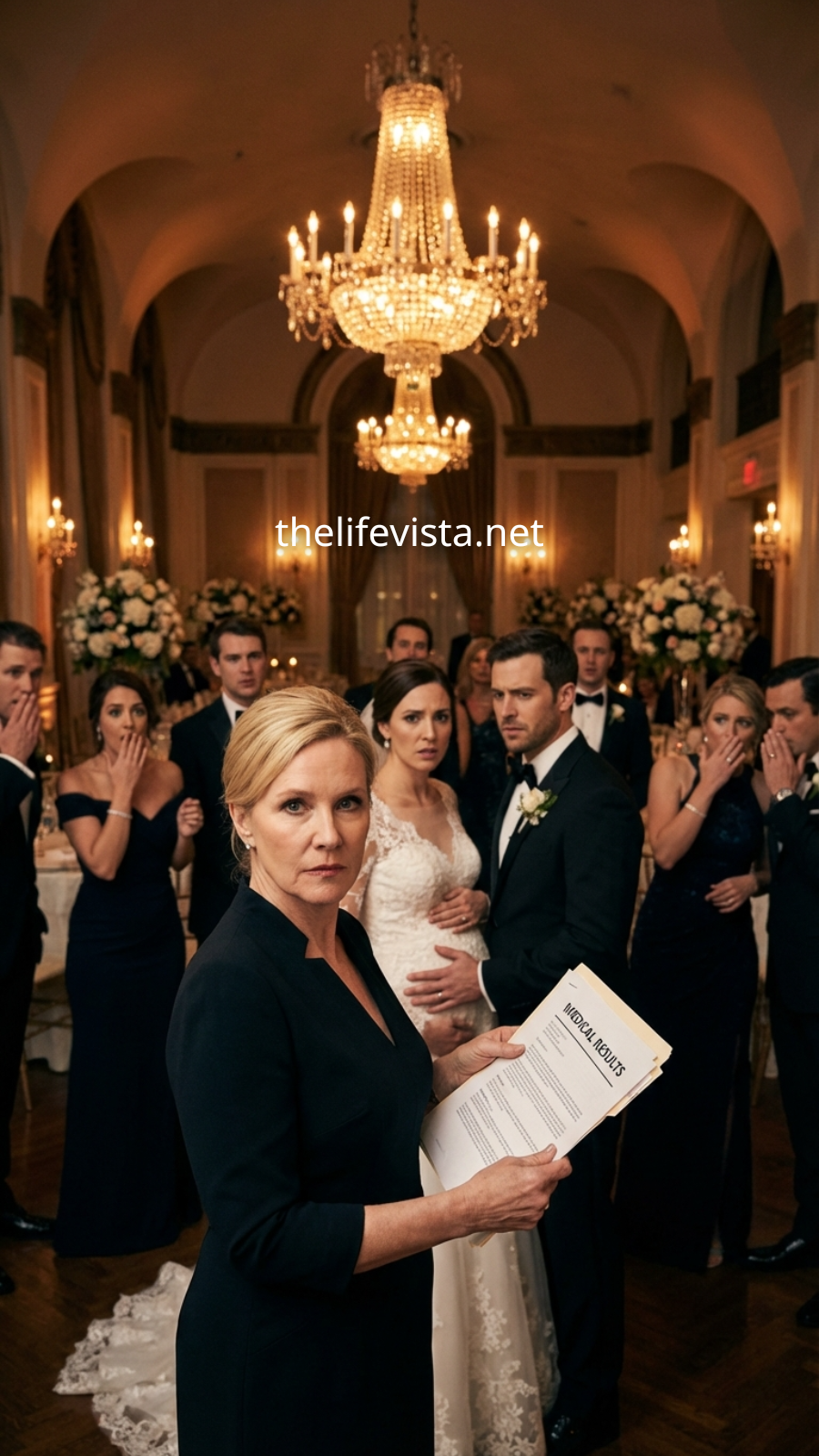 The once-confident groom stood motionless, his jaw clenched, his eyes flicking anxiously between Sarah and the medical document in her hand.