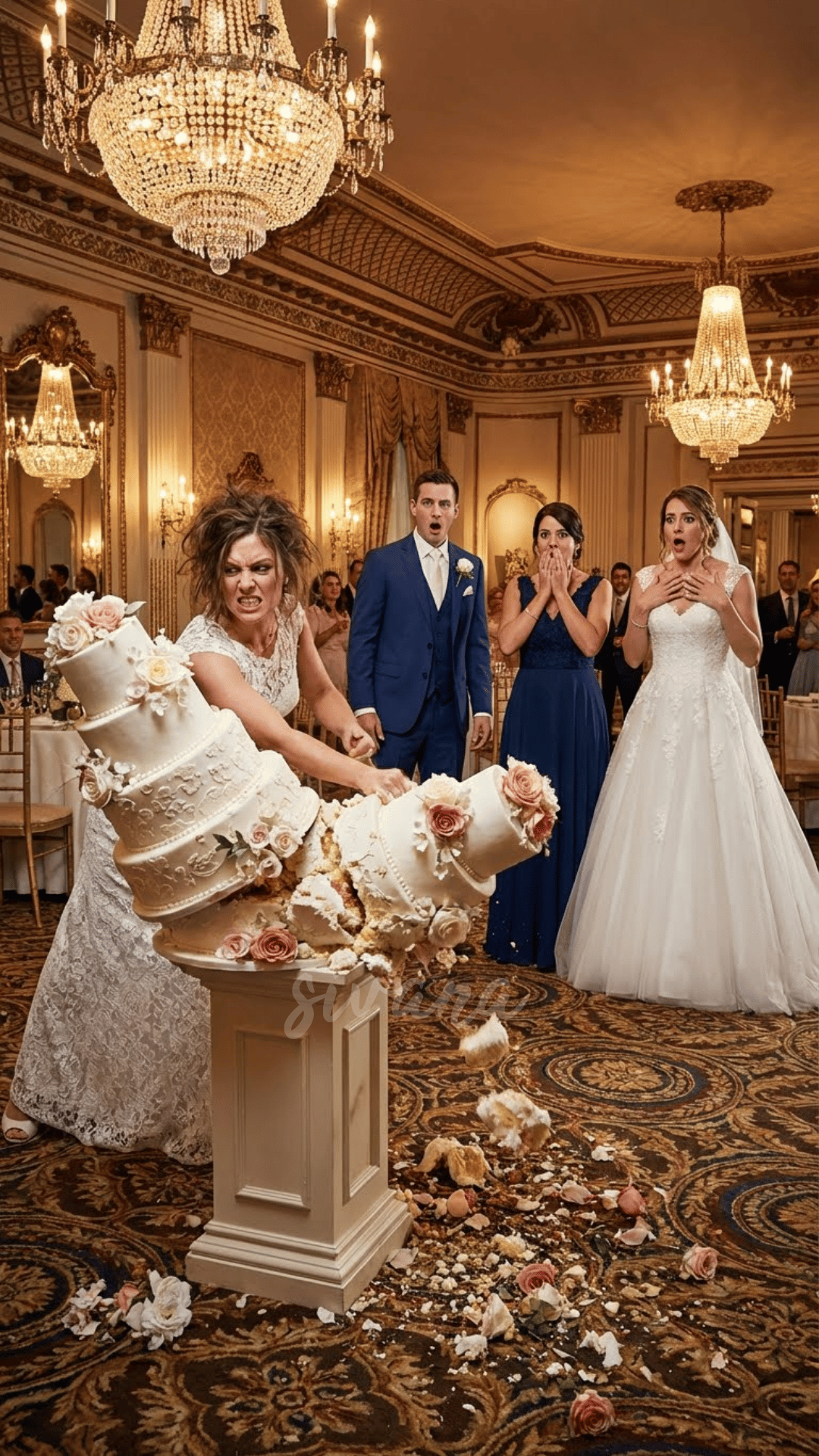 Then she threw it. The champagne flew in a perfect arc and exploded against the dessert table, shattering a photo frame of me and Ava smiling on a cliffside in Maui. Then she grabbed the wedding cake and shoved it like she was flipping a table. The cake didn’t just fall, it collapsed. Three layers, delicate sugar work, custom flowers, all smeared across the floor. She looked me dead in the eye and screamed it loud enough for people outside the venue to hear: