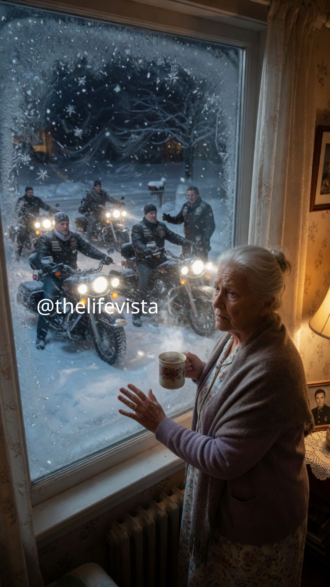 I pulled the curtain back just a fraction to look outside. Through the blinding white sheets of snow, I saw them. Nine motorcycles, heavy machines with wide tires designed for bad weather and chrome that caught the dim yellow glow of the struggling streetlights. They looked like prehistoric beasts emerging from the ice and wind. They pulled up right in front of my house, the riders’ silhouettes hulking and dark against the drifting snow.