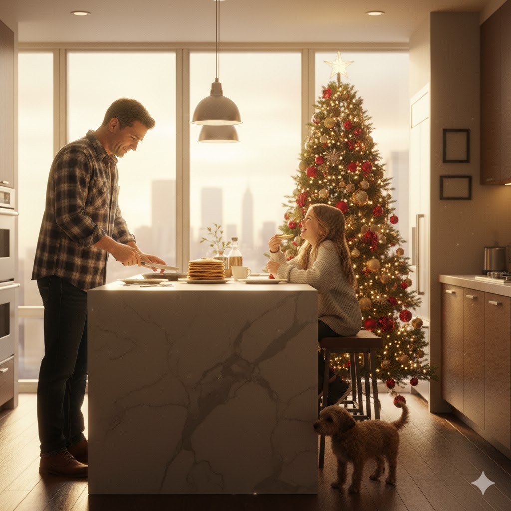 Morning sunlight spilled across the penthouse. Sophie woke to the smell of pancakes and the sound of Rusty’s paws skittering on the floor. Jacob stood in the kitchen — sleeves rolled up, awkwardly flipping pancakes like a man relearning how to live.