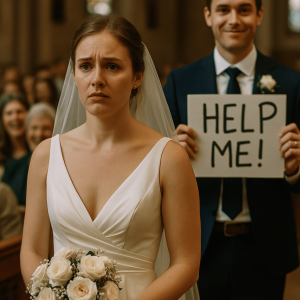 At their wedding, the bride discovered her groom holding a sign that said “HELP ME,” making the entire church burst into laughter — but instead of breaking down, she calmly called off the marriage at the altar and walked away with her dignity intact.