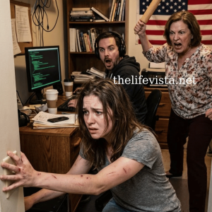 My husband sat at his computer with his headphones on while my mother-in-law hit me with a rolling pin, yelling, “This is for not taking out the trash!” I waited until she was out of breath, then quietly moved toward the outlet. The moment she realized what I was about to do, she panicked and screamed, “No—don’t… not that…”