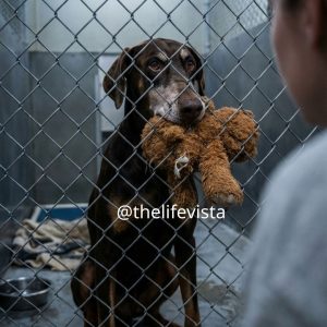 He had nothing left except an old teddy bear and a fragile hope that someone might choose him. So every time a stranger stopped at his kennel, the Doberman tried to trade the only thing he loved for a home.