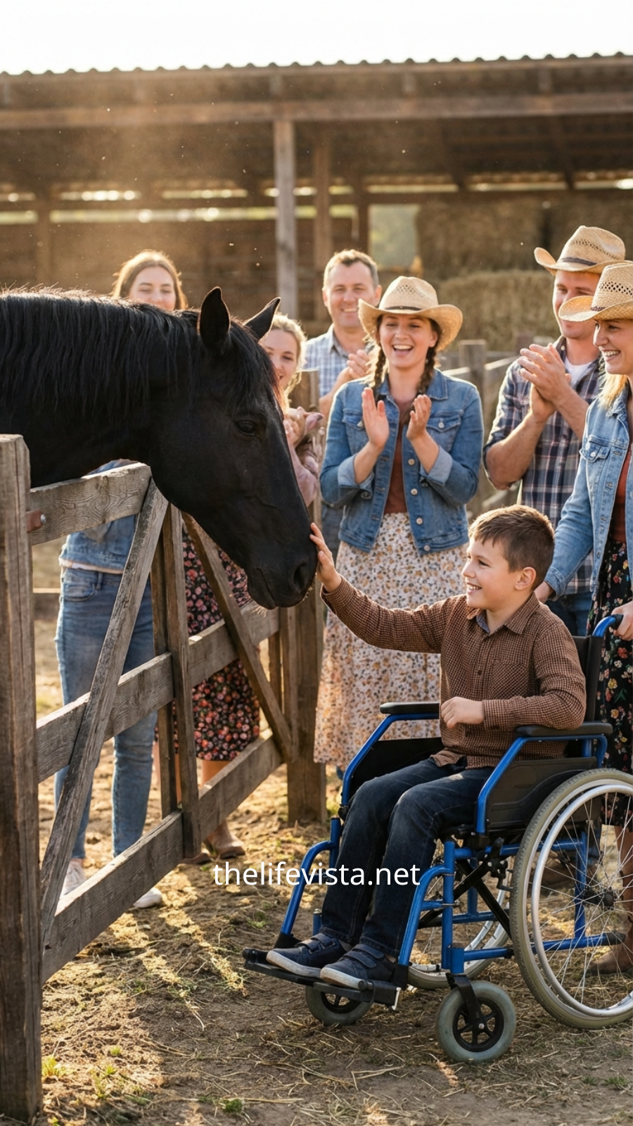 The boy brought his wheelchair to a stop at the edge of the ring. His breathing remained slow and controlled, betraying not a trace of fear. He said nothing. Even when the stallion snorted sharply and struck the dirt with a powerful hoof, the boy did not flinch.